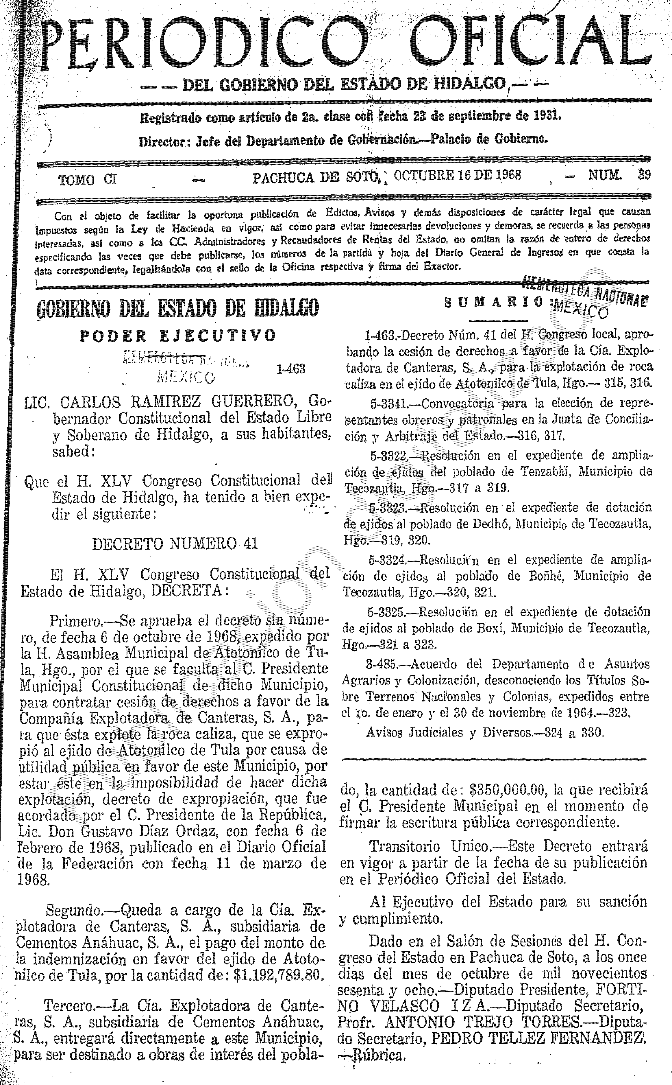 - 1-463.- Decreto Núm. 41 del H. Congreso local, aprobando la cesión de derechos a favor de la Cía. Explotadora de Canteras, S.A., para la explotación de roca caliza en el ejido de Atotonilco de Tula, Hgo.