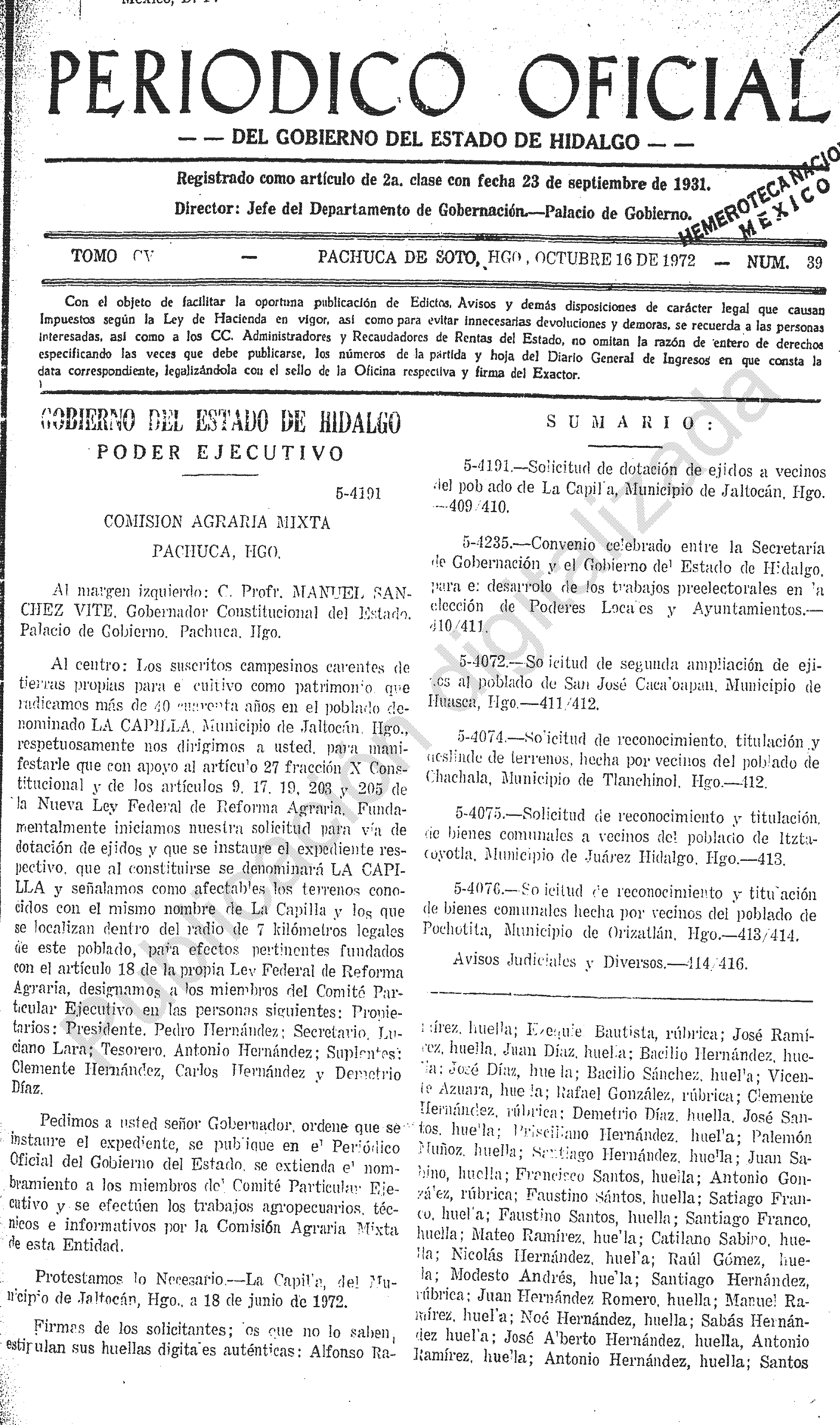 - 5-4191.- Solicitud de dotación de ejidos a vecinos del poblado de La Capilla, Municipio de Jaltocán, Hgo.
