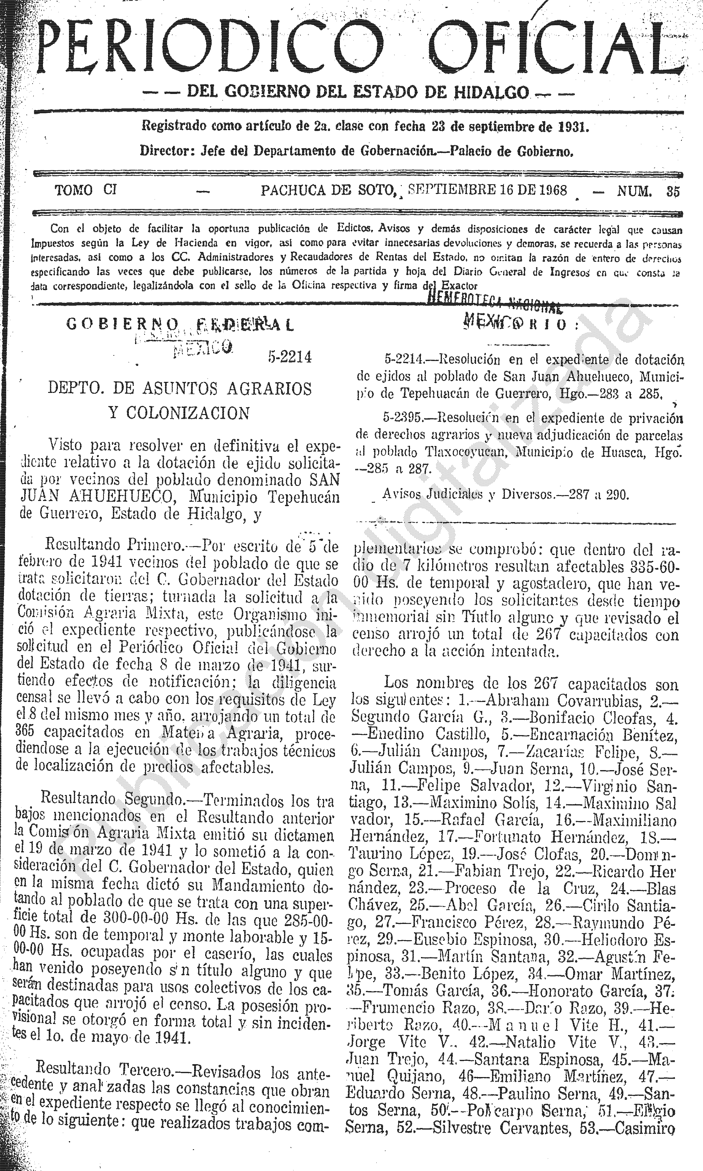 • 5-2214.- Resolución en el expediente de dotación de ejidos al poblado de San Juan Ahuehueco, Municipio de Tepehuacán de Guerrero, Hgo.