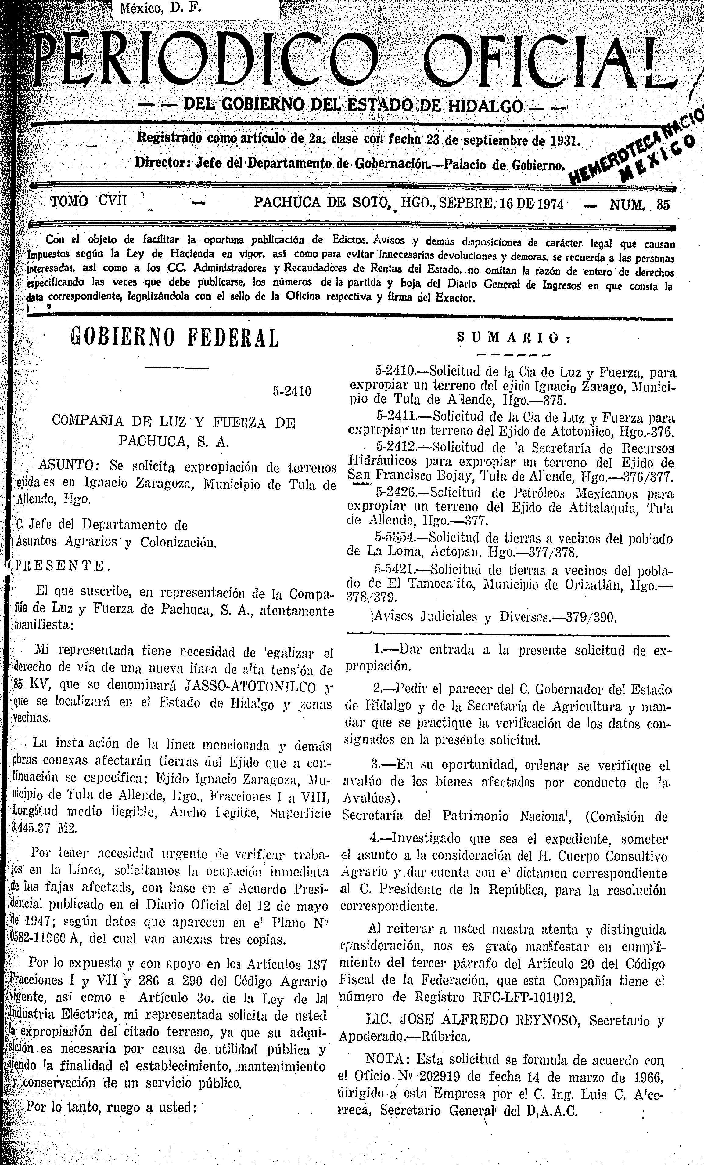 • 5-2410.- Solicitud de la Cía. de Luz y Fuerza, para expropiar un terreno del ejido Ignacio Zaragoza, Municipio de Tula de Allende, Hgo.