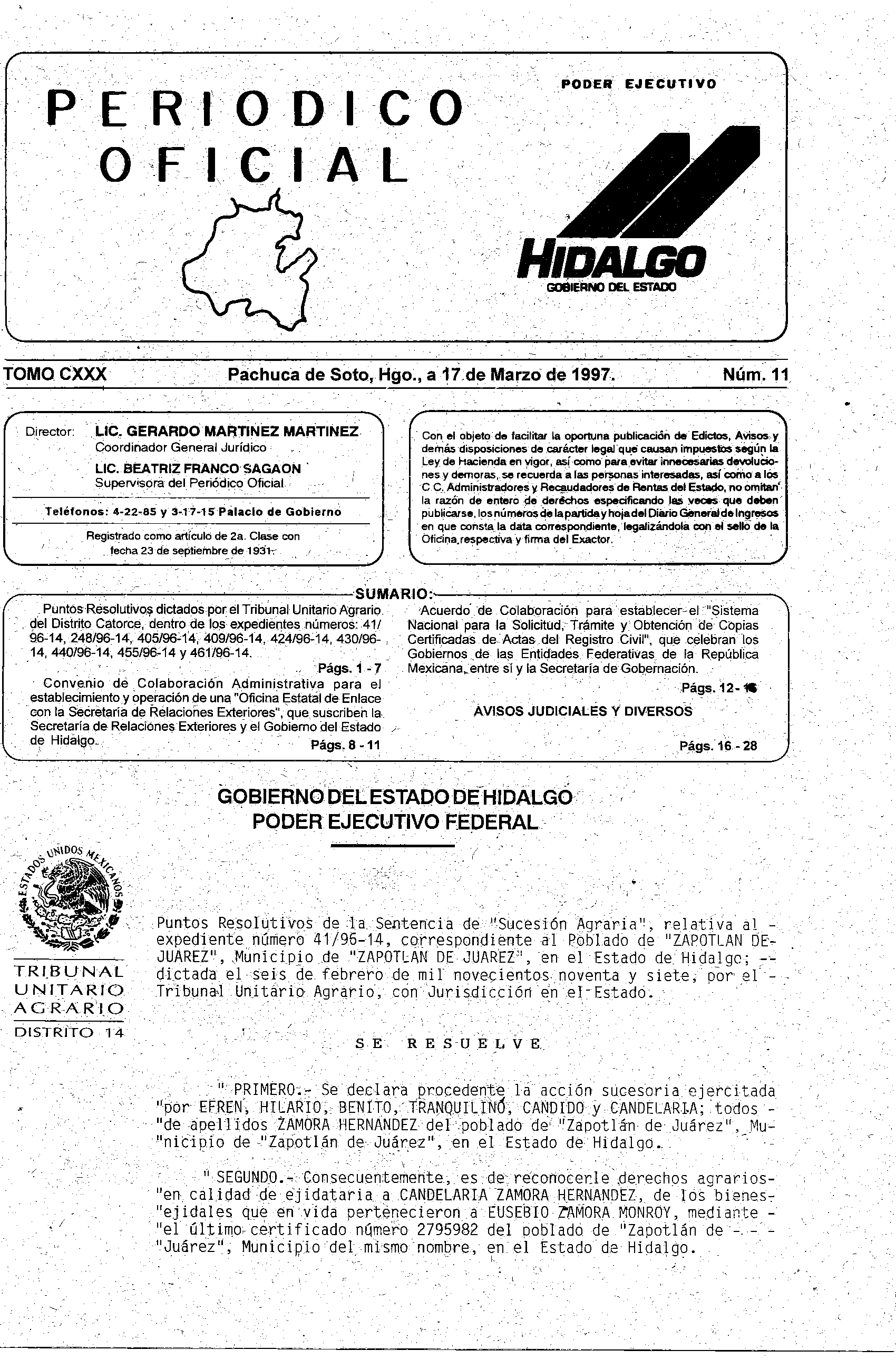 - Puntos Resolutivos dictados por el Tribunal Unitario Agrario del Distrito Catorce, dentro de los expedientes números: 41/96-14, 248/96-14, 405/96-14, 409/96-14, 424/96-14, 430/96-14, 440/96-14, 455/96-14 y 461/96-14.