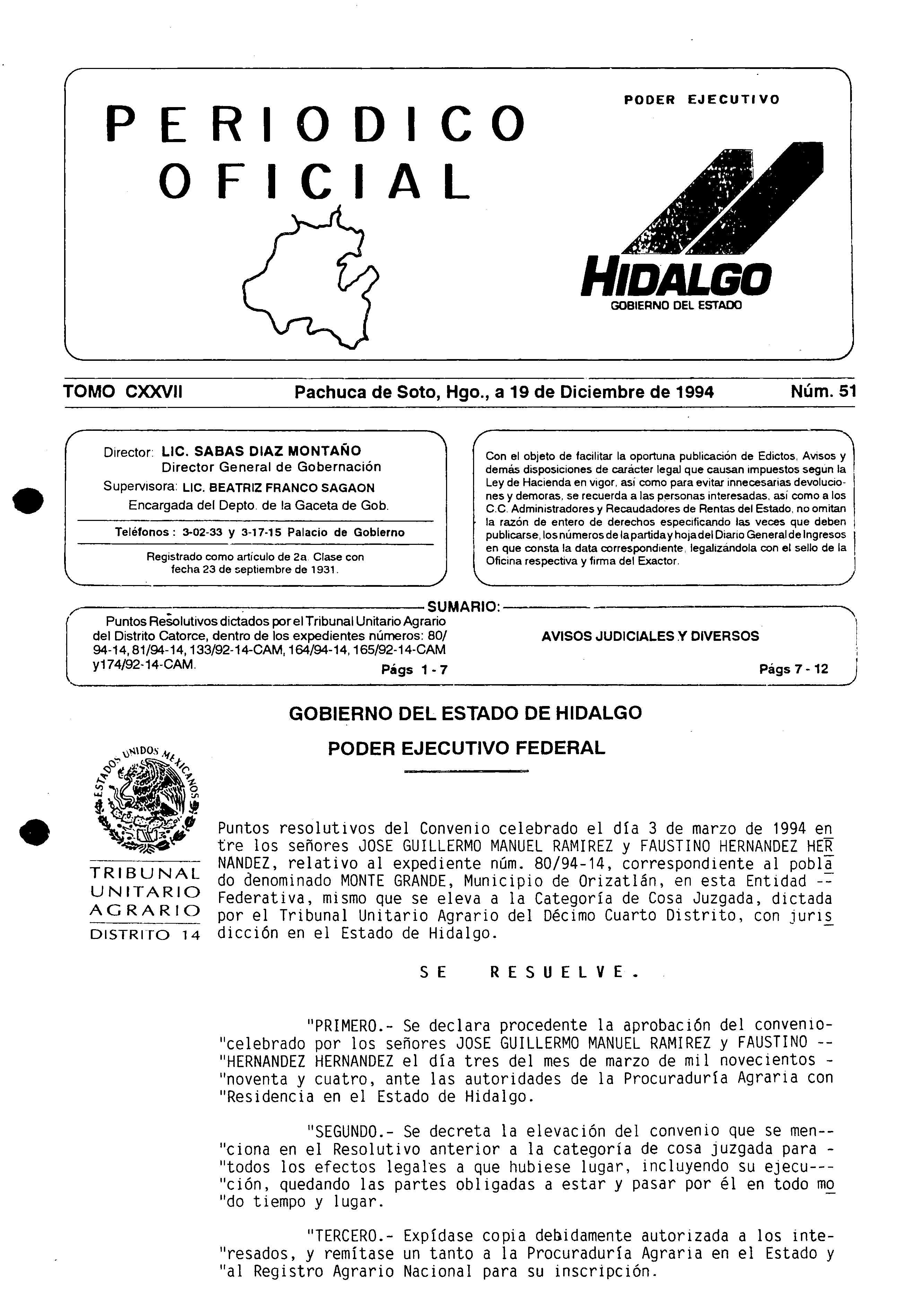 Periódico Oficial Ordinario 0 del 19 de diciembre de 1994