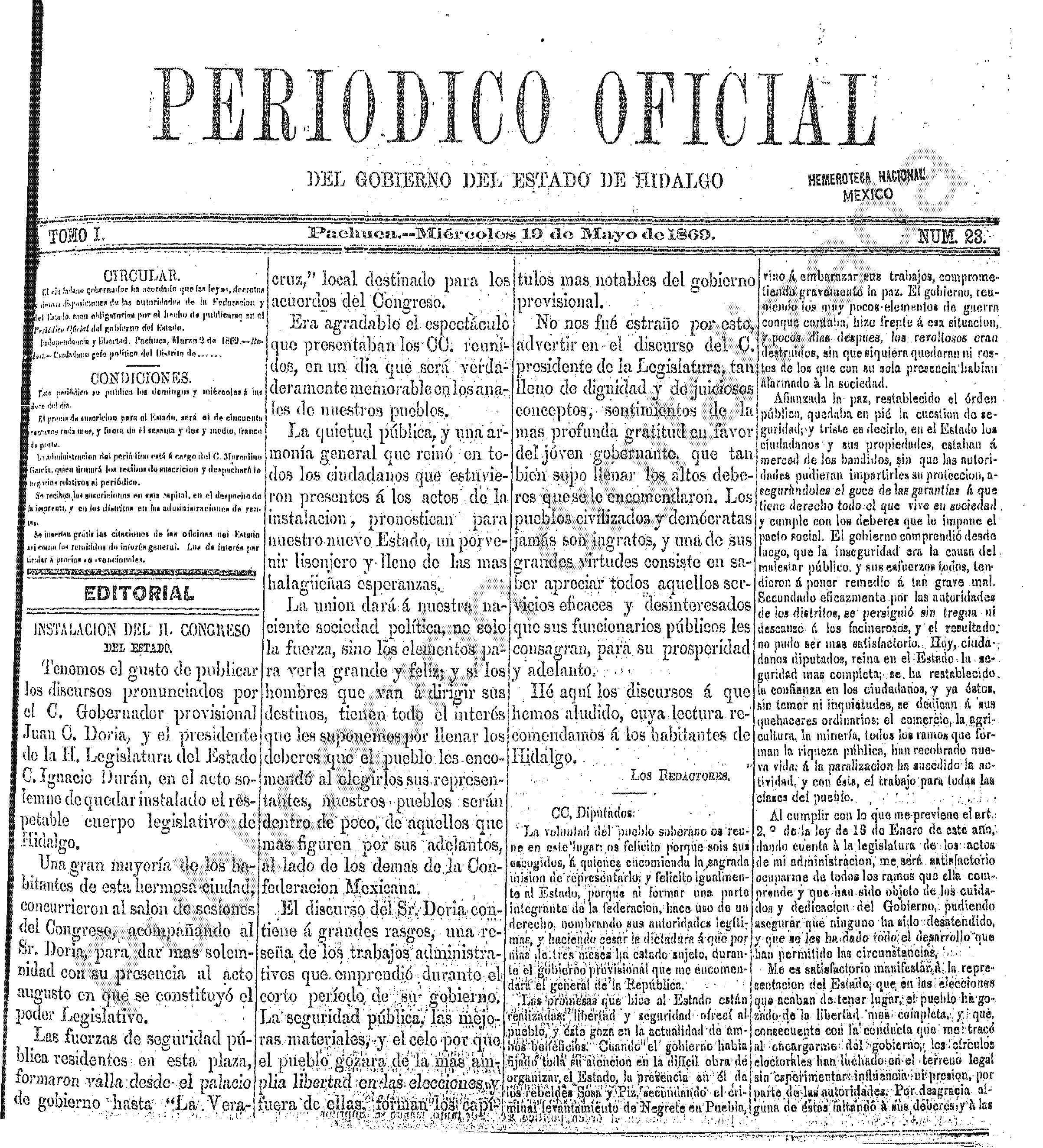Descargar Periódico Oficial Ordinario 0 del 19 de mayo de 1869El portal web del Periódico Oficial del Estado de hidalgo es el único medio de difusión oficial del Gobierno del Estado de Hidalgo