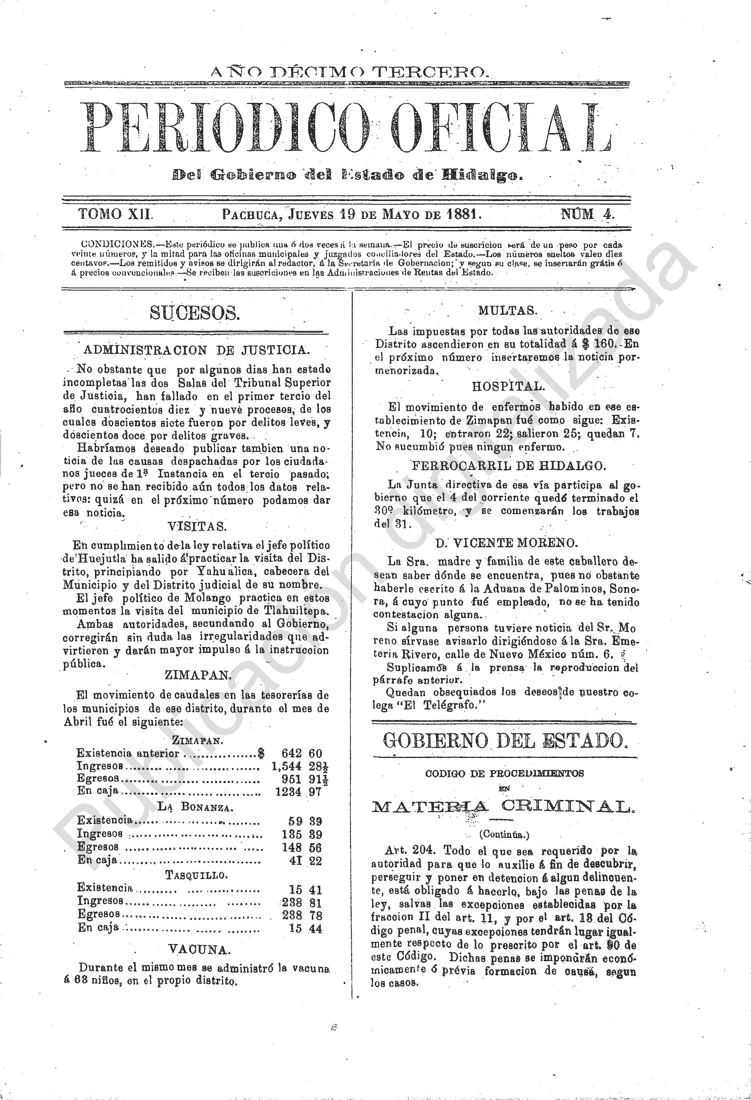 Descargar Periódico Oficial Ordinario 0 del 19 de mayo de 1881El portal web del Periódico Oficial del Estado de hidalgo es el único medio de difusión oficial del Gobierno del Estado de Hidalgo
