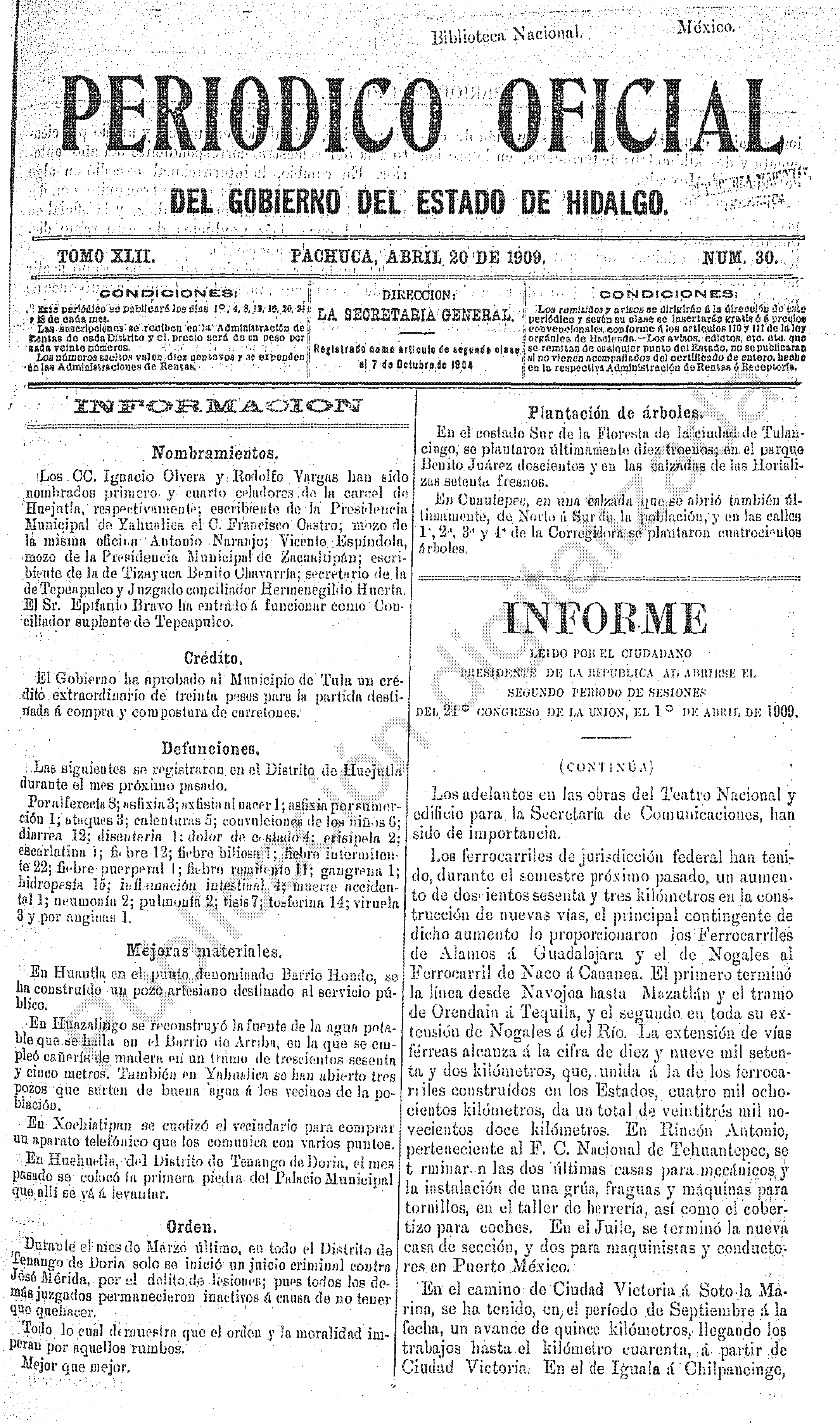 Descargar Periódico Oficial Ordinario 0 del 20 de abril de 1909Tamaño 796.43 KB
