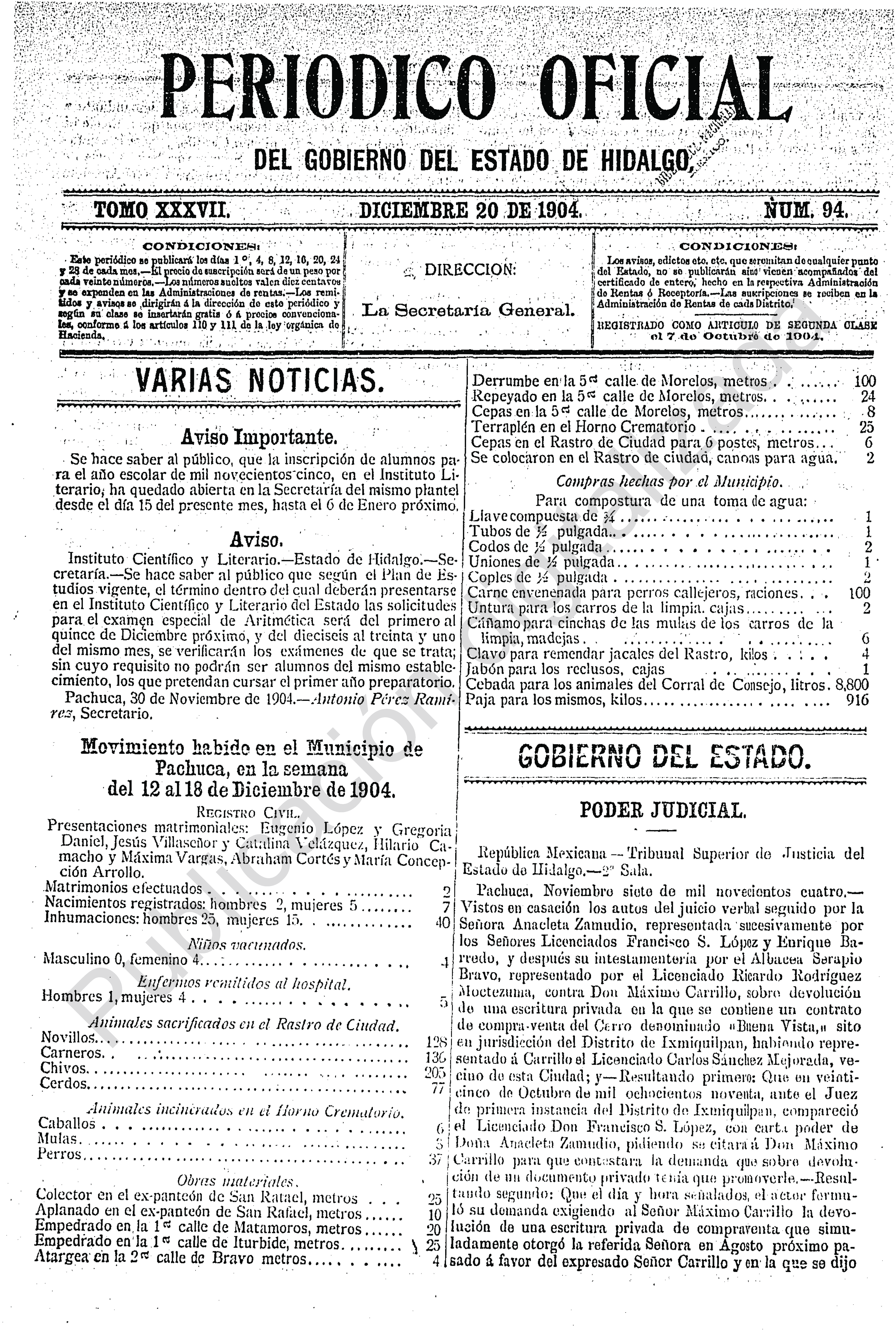 Periódico Oficial Ordinario 0 del 20 de diciembre de 1904