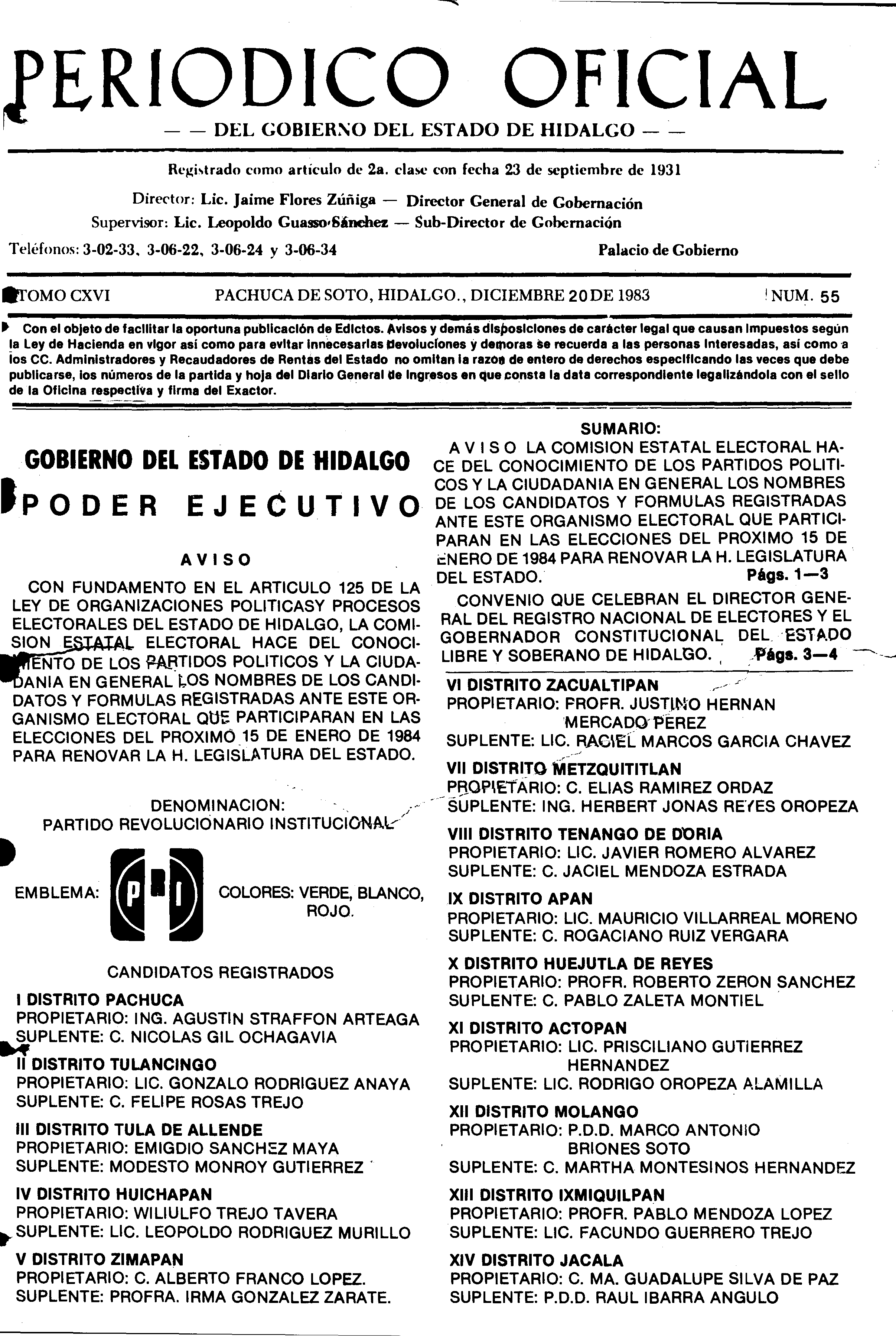• Aviso de la Comisión Estatal Electoral hace del conocimiento de los Partidos Politicos y la ciudadania en general los nombres de los candidatos y fórmulas registradas ante este Organismo Electoral que participaran en las elecciones del Próximo15 de Enero de 1984, para renovar la H. Legislatura del Estado.