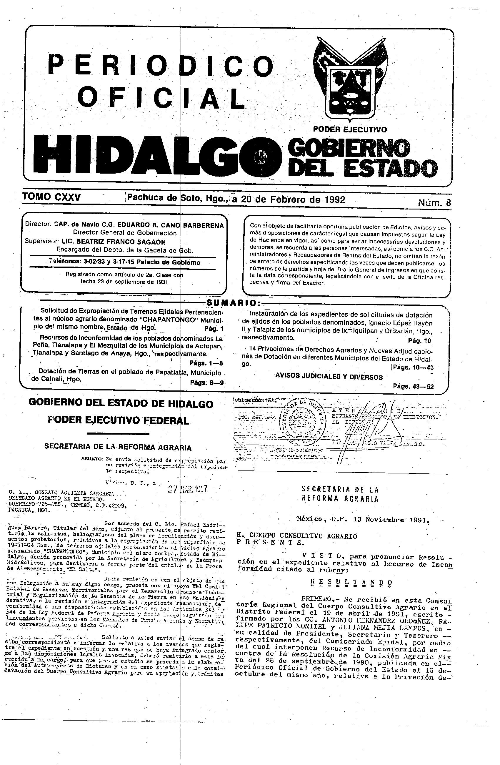 Descargar Periódico Oficial Ordinario 0 del 20 de febrero de 1992