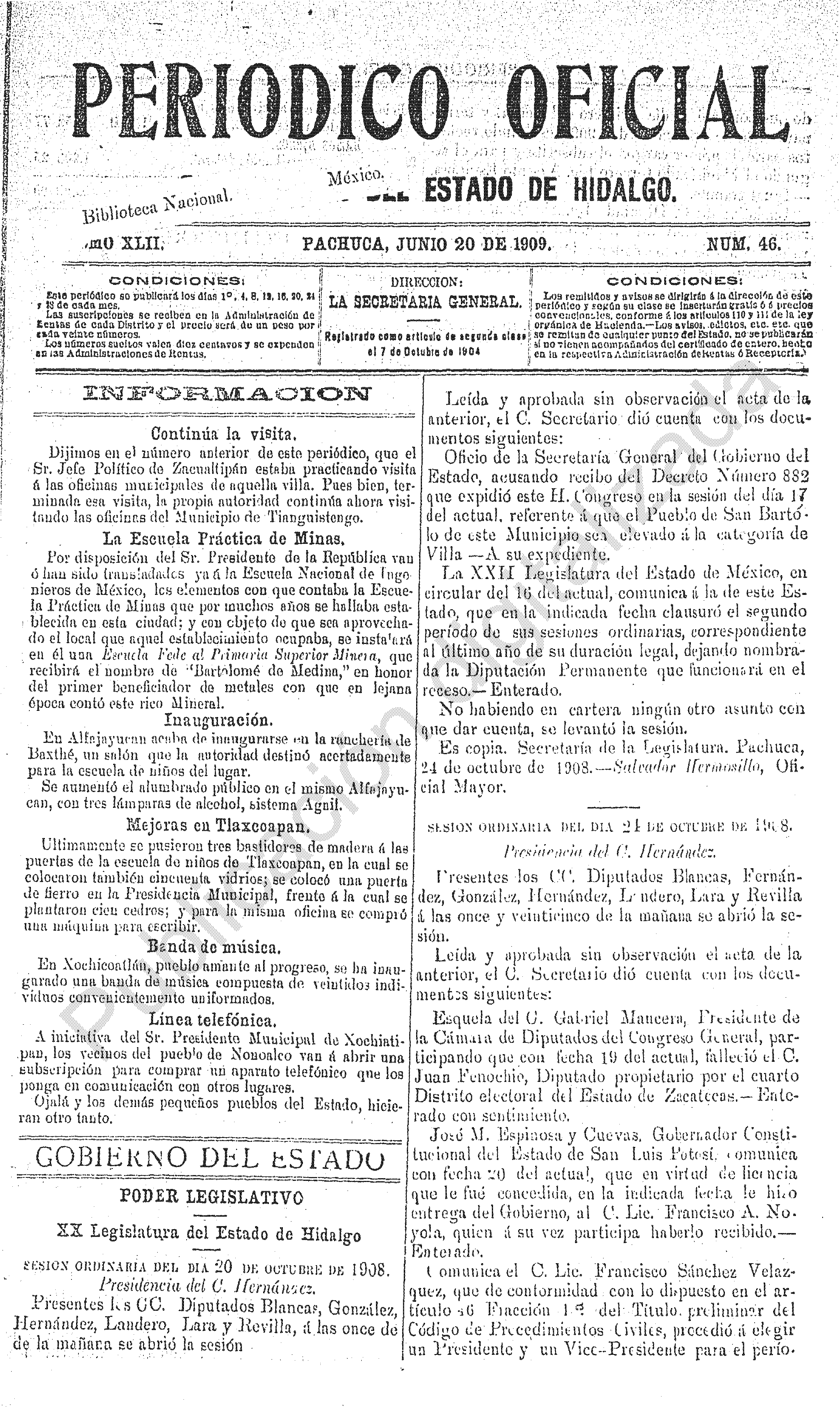 Descargar Periódico Oficial Ordinario 0 del 20 de junio de 1909Tamaño 853.64 KB