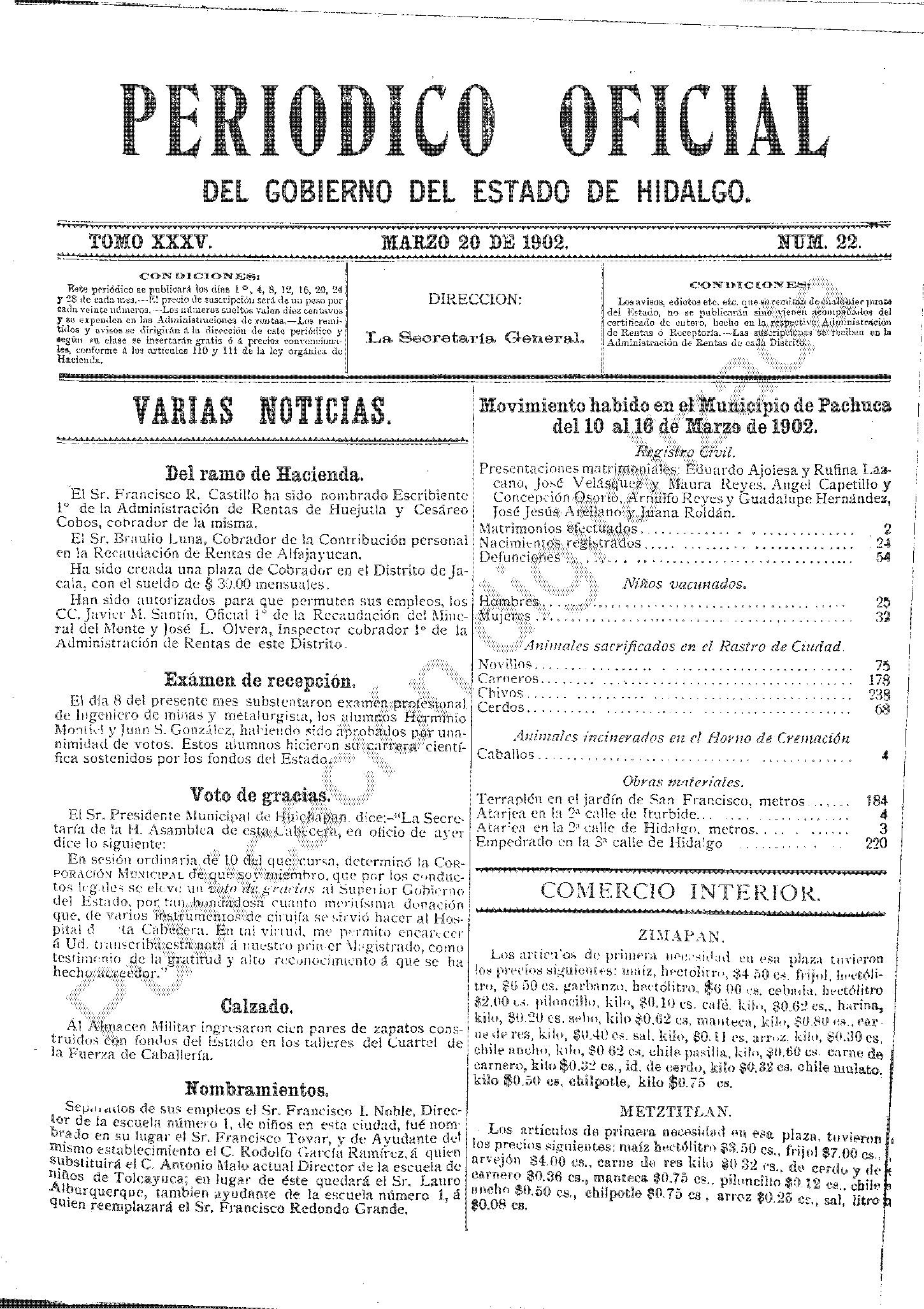 Descargar Periódico Oficial Ordinario 0 del 20 de marzo de 1902El portal web del Periódico Oficial del Estado de hidalgo es el único medio de difusión oficial del Gobierno del Estado de Hidalgo