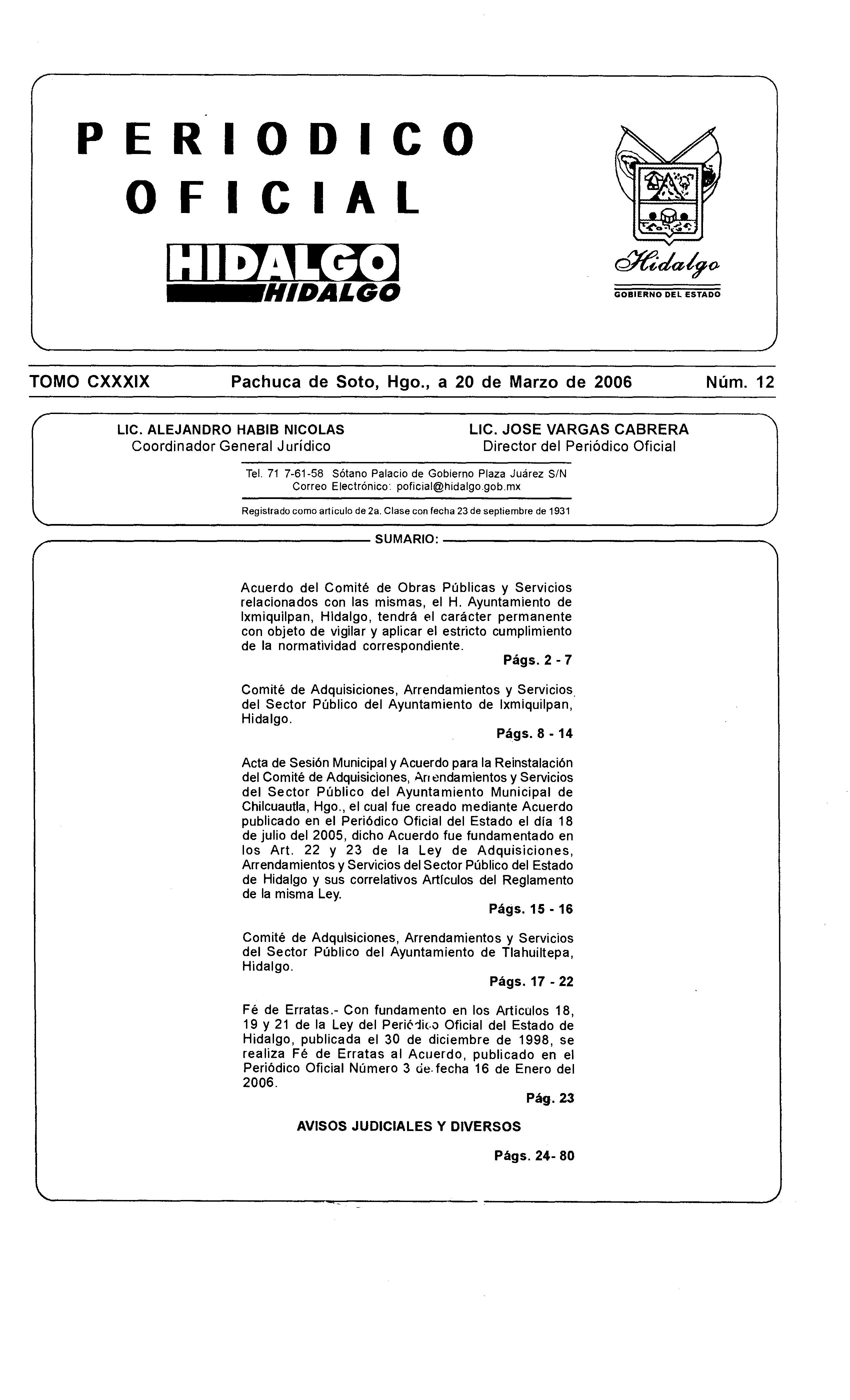 - Fé de Erratas.- Con fundamento en los Artículos 18, 19 y 21 de la Ley del Periódico Oficial del Estado de Hidalgo, publicada el 30 de diciembre de 1998, se realiza Fé de Erratas al Acuerdo, publicado en el Periódico Oficial Número 3 de fecha 16 de Enero del 2006.