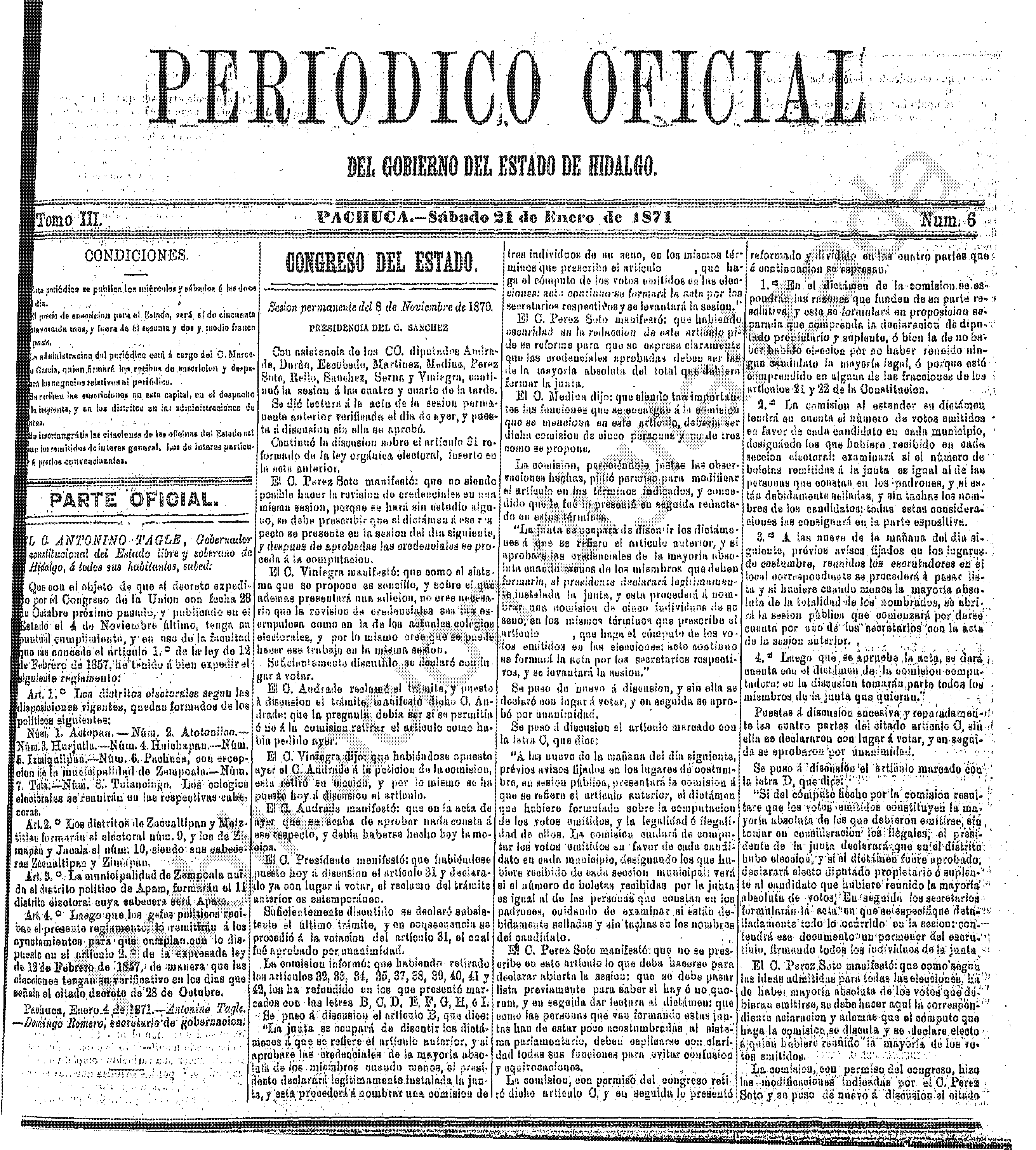 Descargar Periódico Oficial Ordinario 0 del 21 de enero de 1871El portal web del Periódico Oficial del Estado de hidalgo es el único medio de difusión oficial del Gobierno del Estado de Hidalgo