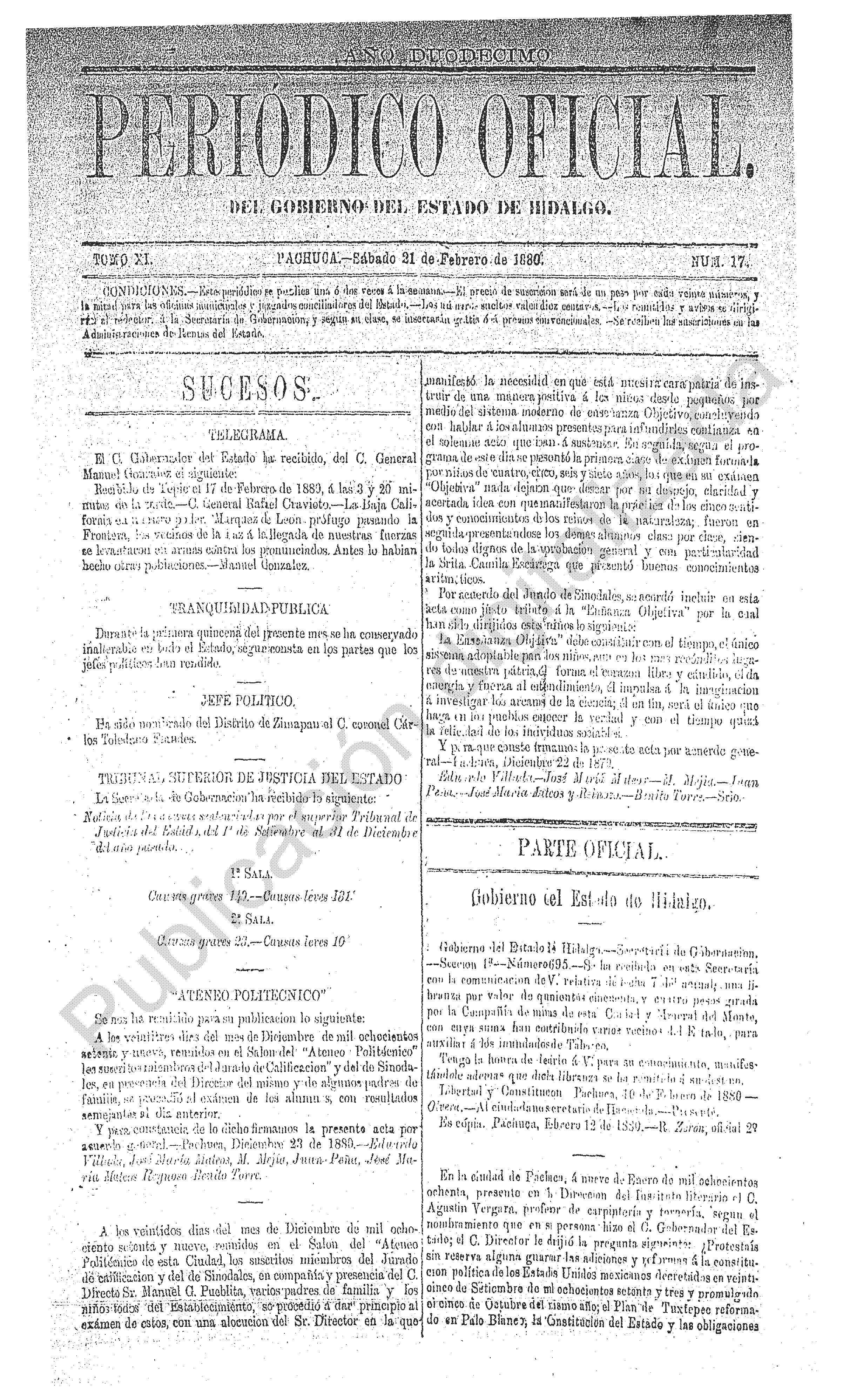 Descargar Periódico Oficial Ordinario 0 del 21 de febrero de 1880El portal web del Periódico Oficial del Estado de hidalgo es el único medio de difusión oficial del Gobierno del Estado de Hidalgo