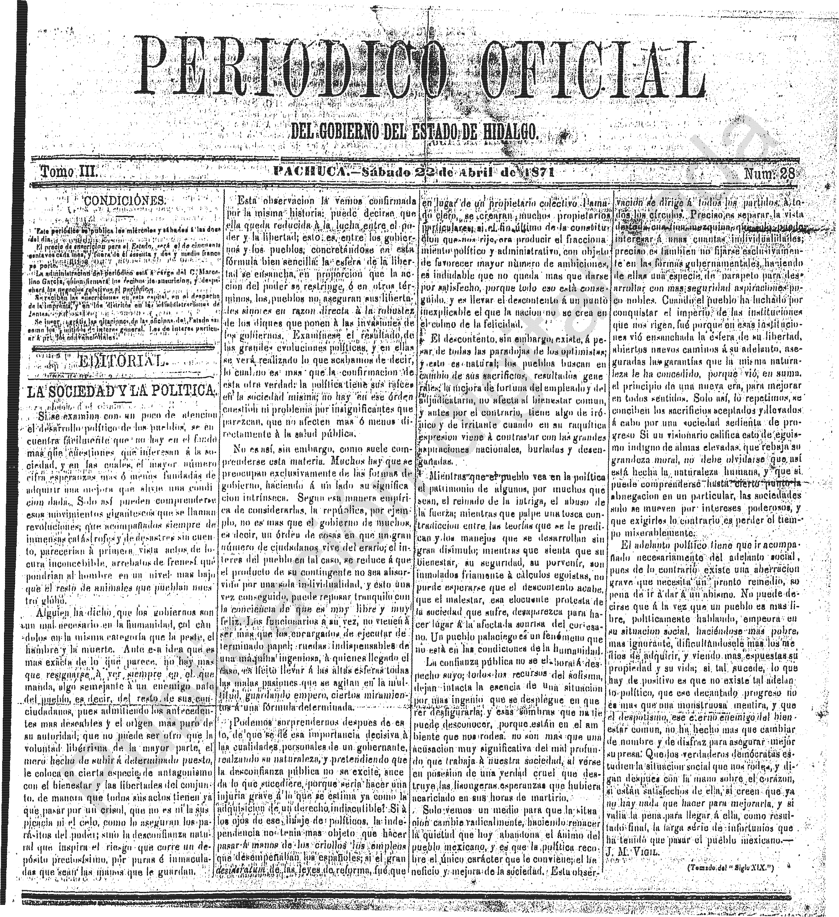 Descargar Periódico Oficial Ordinario 0 del 22 de abril de 1871El portal web del Periódico Oficial del Estado de hidalgo es el único medio de difusión oficial del Gobierno del Estado de Hidalgo