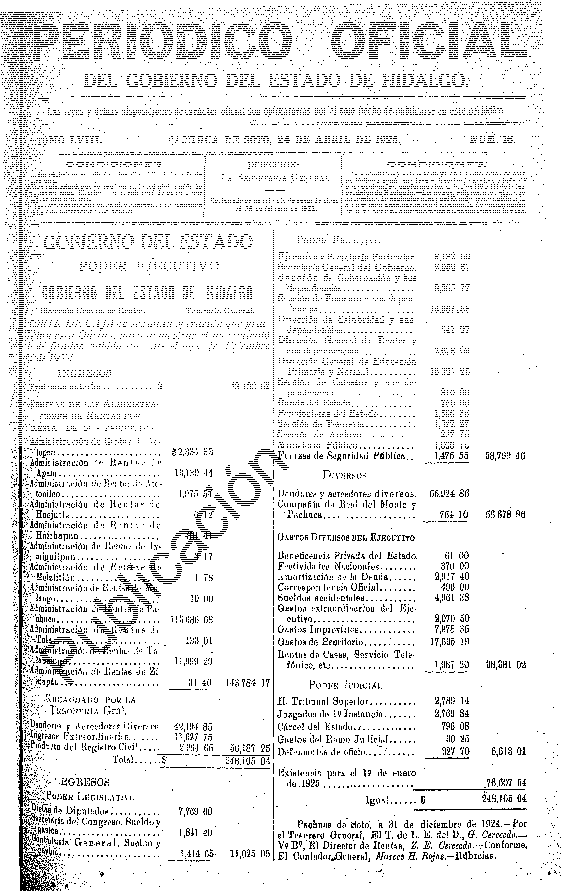 • Poder Ejecutivo.- Corte de caja de segunda operación que practica la oficina competente, para demostrar el movimiento de fondos habido durante el mes de diciembre de 1924./Decreto #8 derogaciones conforme a la Universidad del Estado de Hidalgo./Decreto #9./Decreto #10 LEY DEL DESCANSO DOMINICAL.