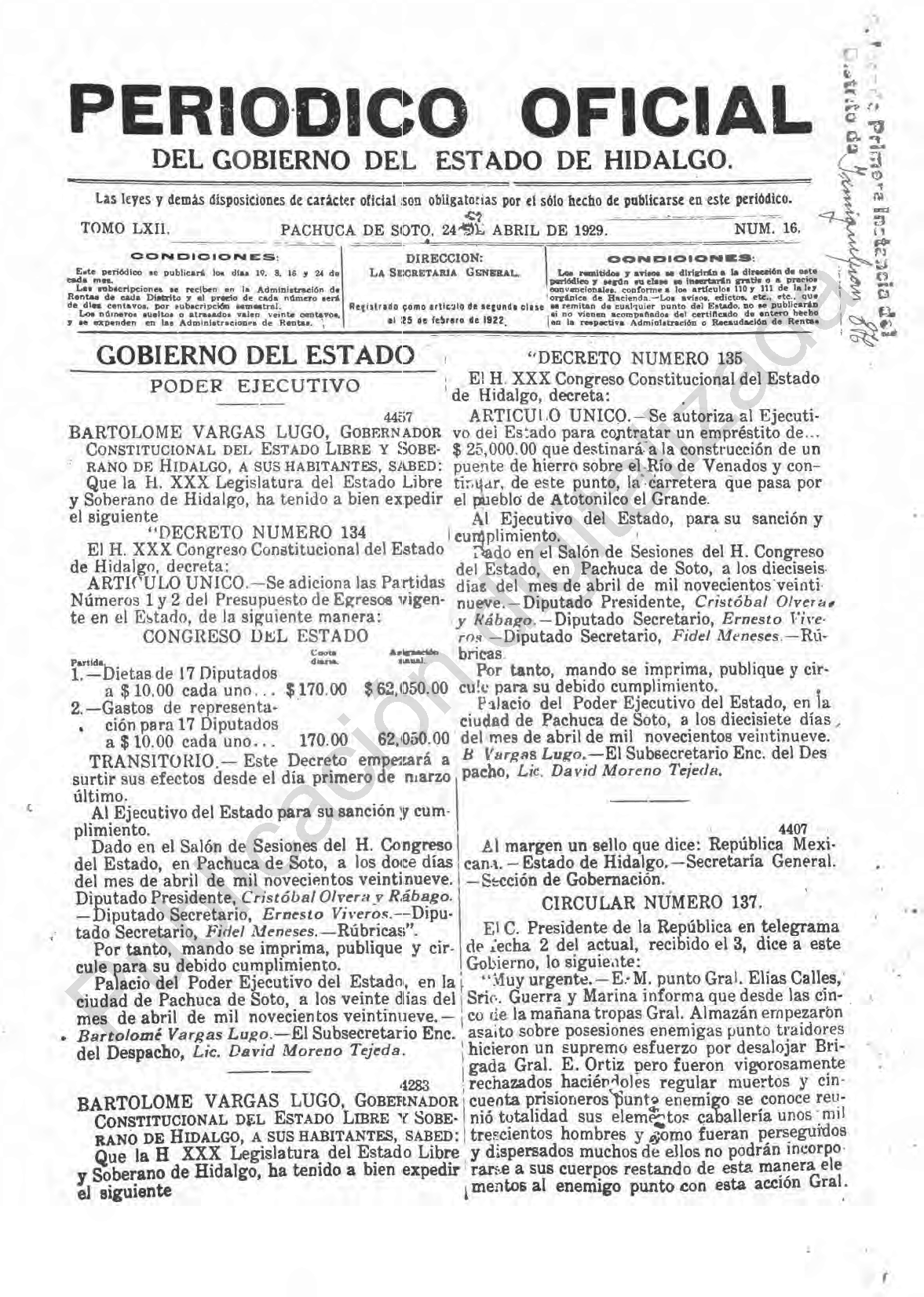 - 4283.-DECRETO NUMERO 135.-Se autoriza al Ejecutivo del Estado para contratar un emprestito de $25,000.00 que destinará a la construcción de un puente de hierro sobre el Rio de Venados y continuar, de este punto, la carretera que pasa por el pueblo de Atotonilco el Grande.