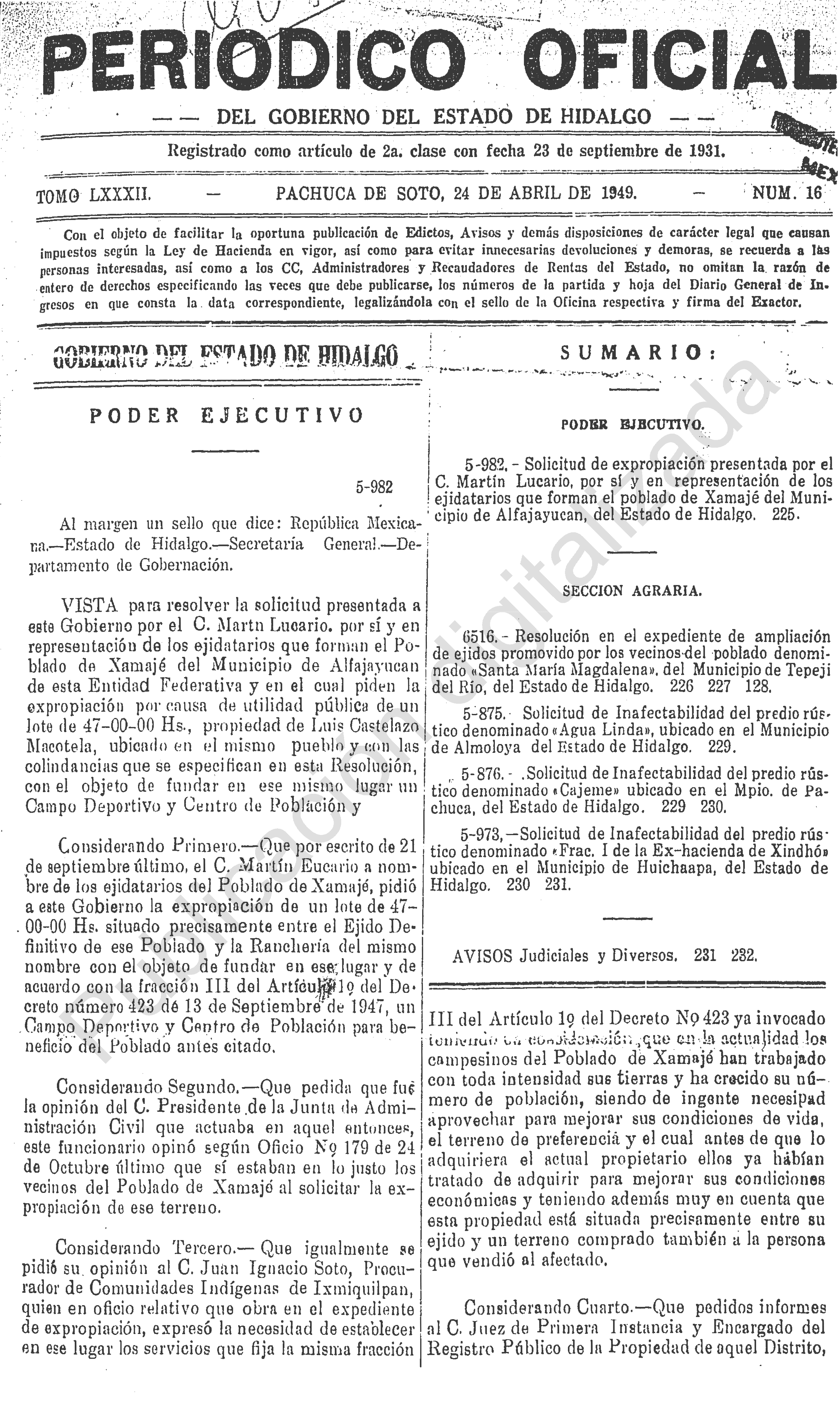 - 5-982.- Solicitud de Expropiación presentada por el C. Martín Lucario, por sí y en representación de los ejidatarios que forman el poblado de Xamajé del Municipio de Alfajayucan, del Estado de Hidalgo.