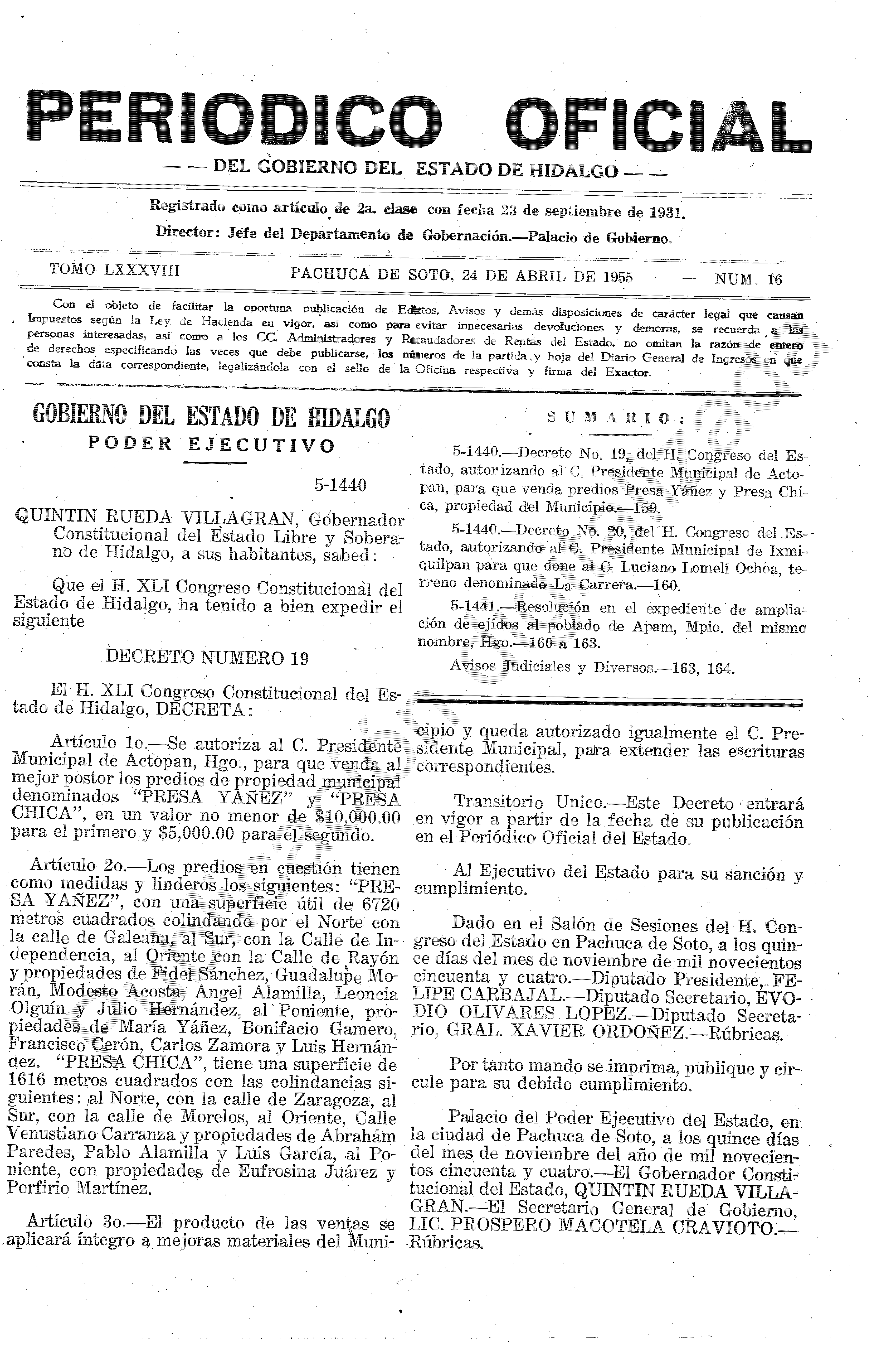 • 5-1440.- Decreto No. 19, del H. Congreso del Estado, autorizando al C. Presidente Municipal de Actopan, para que venda predios Presa Yáñez y Presa Chica, propiedad del Municipio.