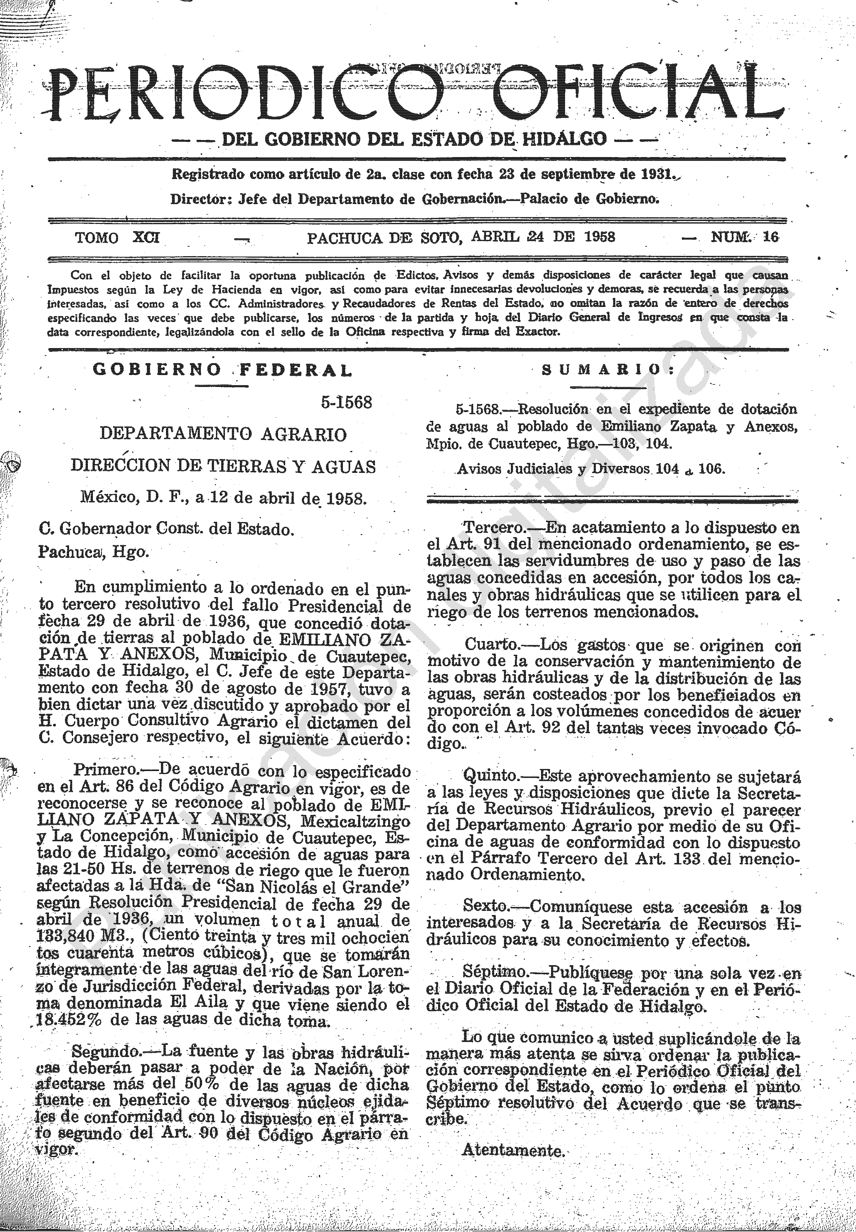 • 5-1568.- Resolución en el expediente de dotación de aguas al poblado de Emiliano Zapata y Anexos, Mpio. de Cuautepec, Hgo.