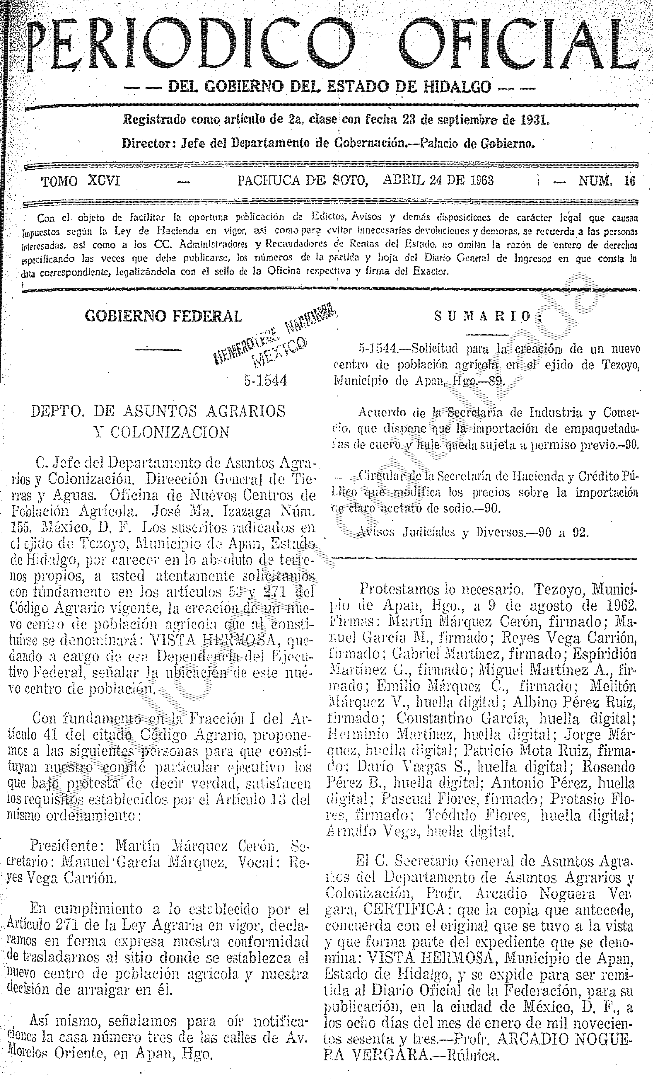 - 5-1544.- Solicitud para la creación de un nuevo centro de población agrícola en el ejido de Tezoyo, Municipio de Apan, Hgo.