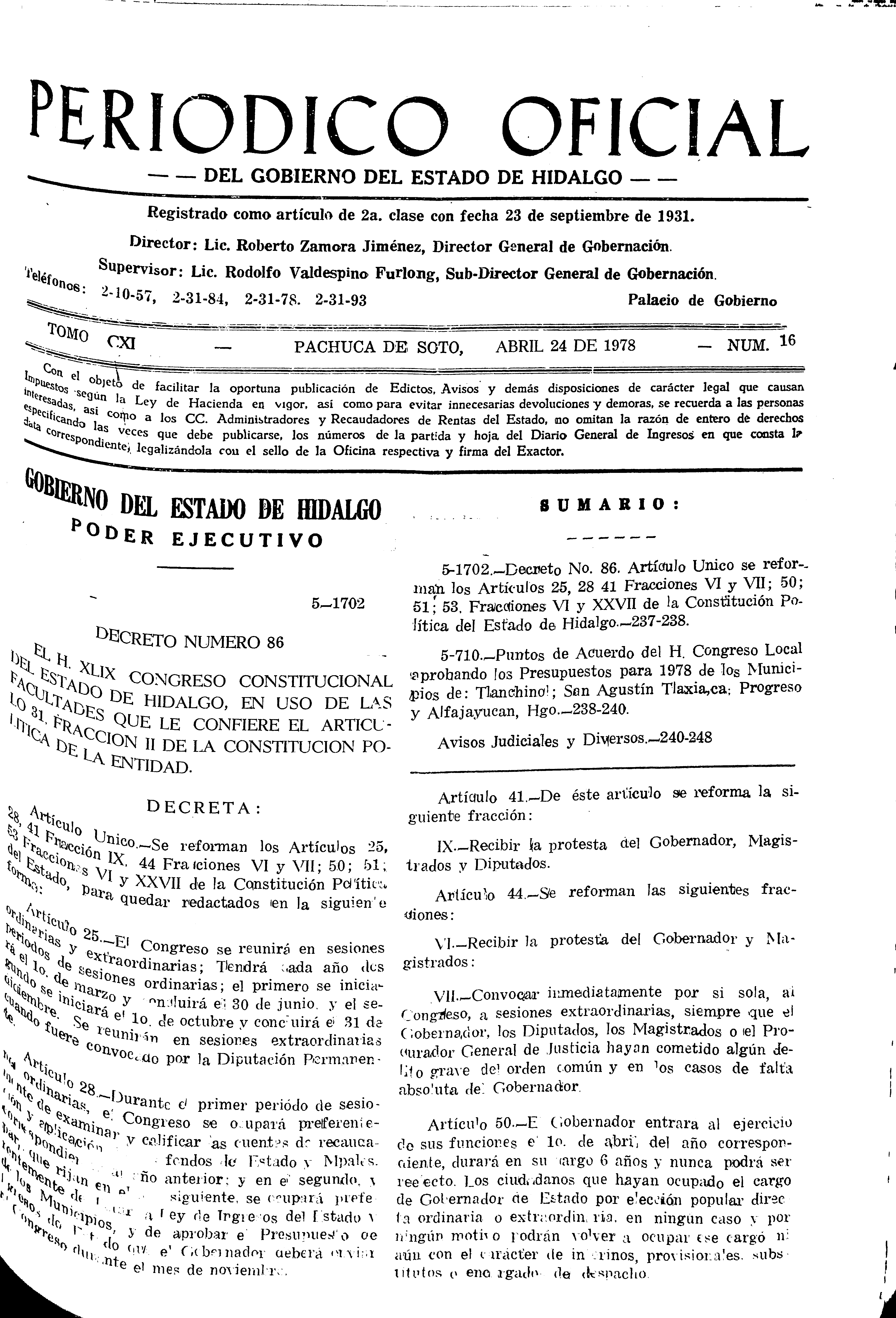Descargar Periódico Oficial Ordinario 0 del 24 de abril de 1978