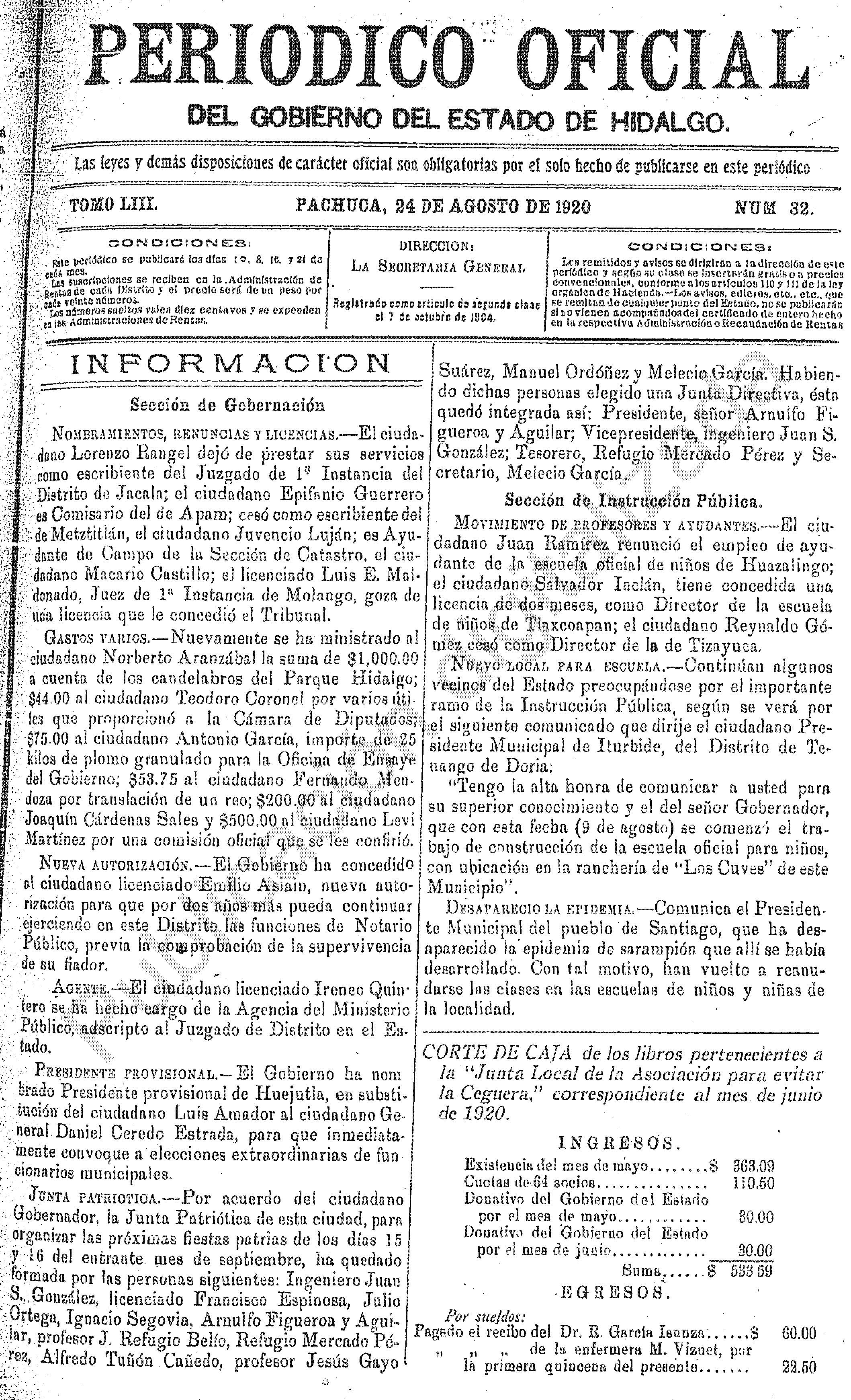 Descargar Periódico Oficial Ordinario 0 del 24 de agosto de 1920El portal web del Periódico Oficial del Estado de hidalgo es el único medio de difusión oficial del Gobierno del Estado de Hidalgo