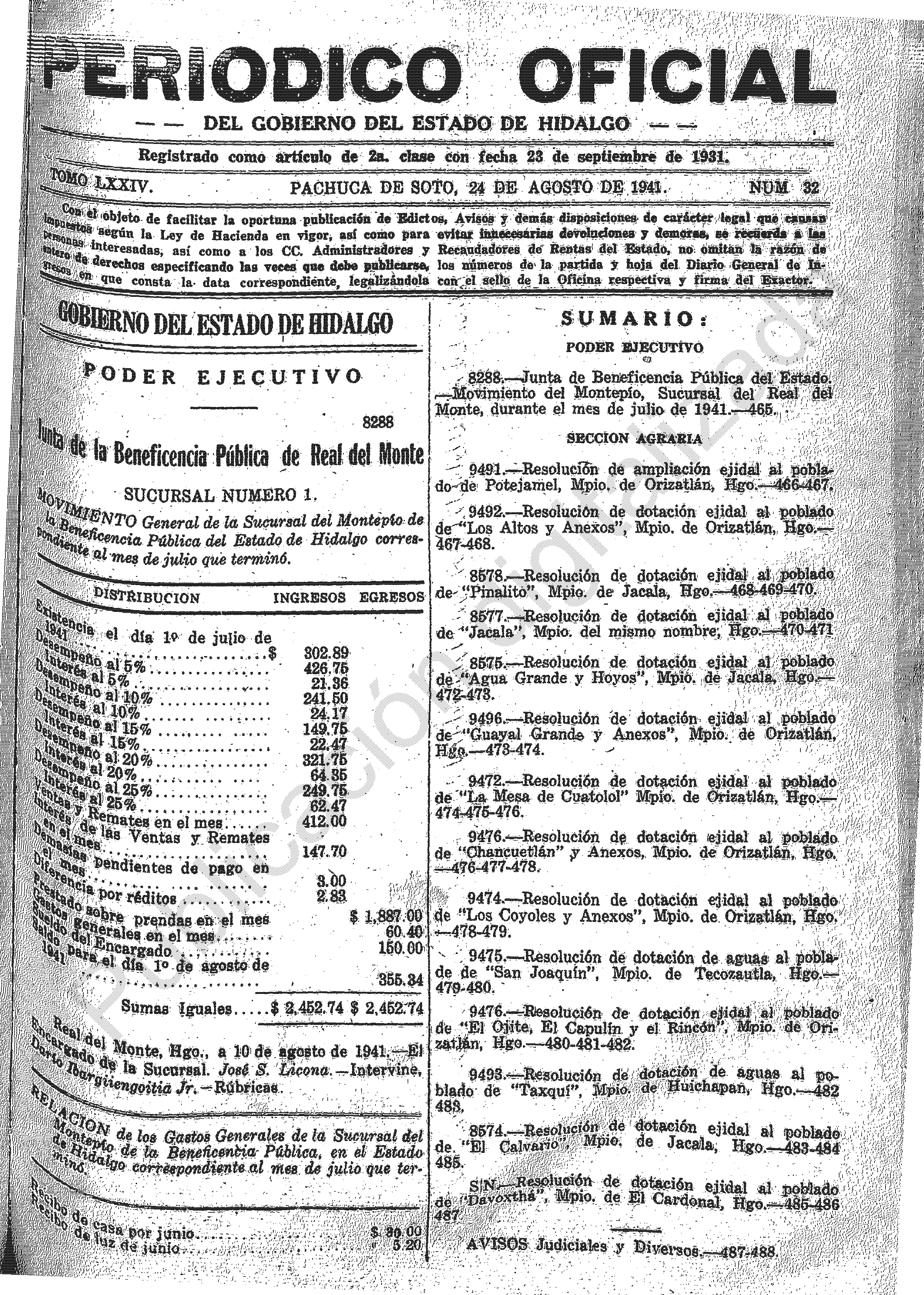 - 9492.- Resolución de dotación ejidal al poblado de “Los Altos y Anexos”, Mpio. de Orizatlán, Hgo.