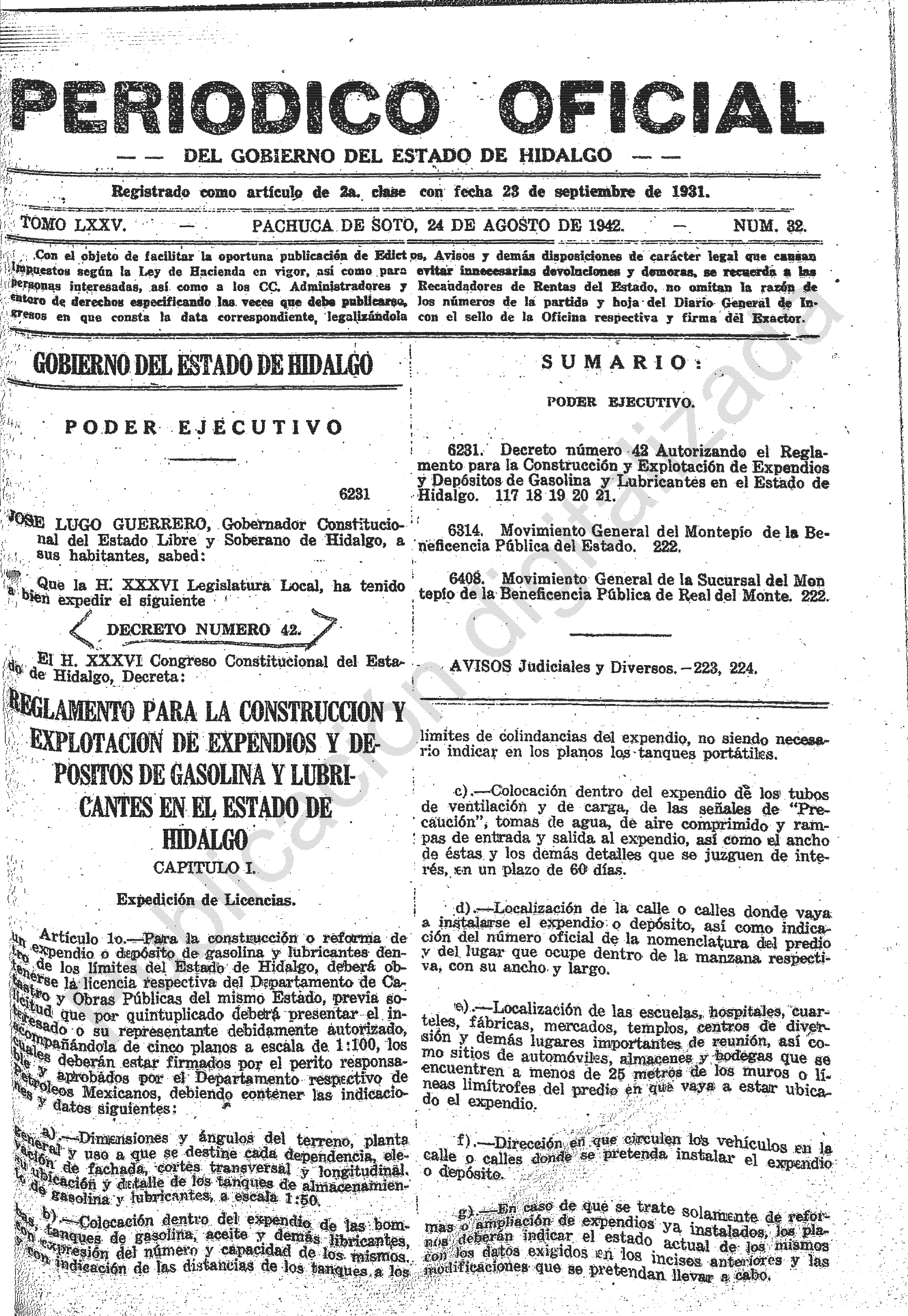 • 6231.- Decreto número 42 Autorización el Reglamento para la Construcción y Explotación de Expendios y Depósitos de Gasolina y Lubricantes en el Estado de Hidalgo.