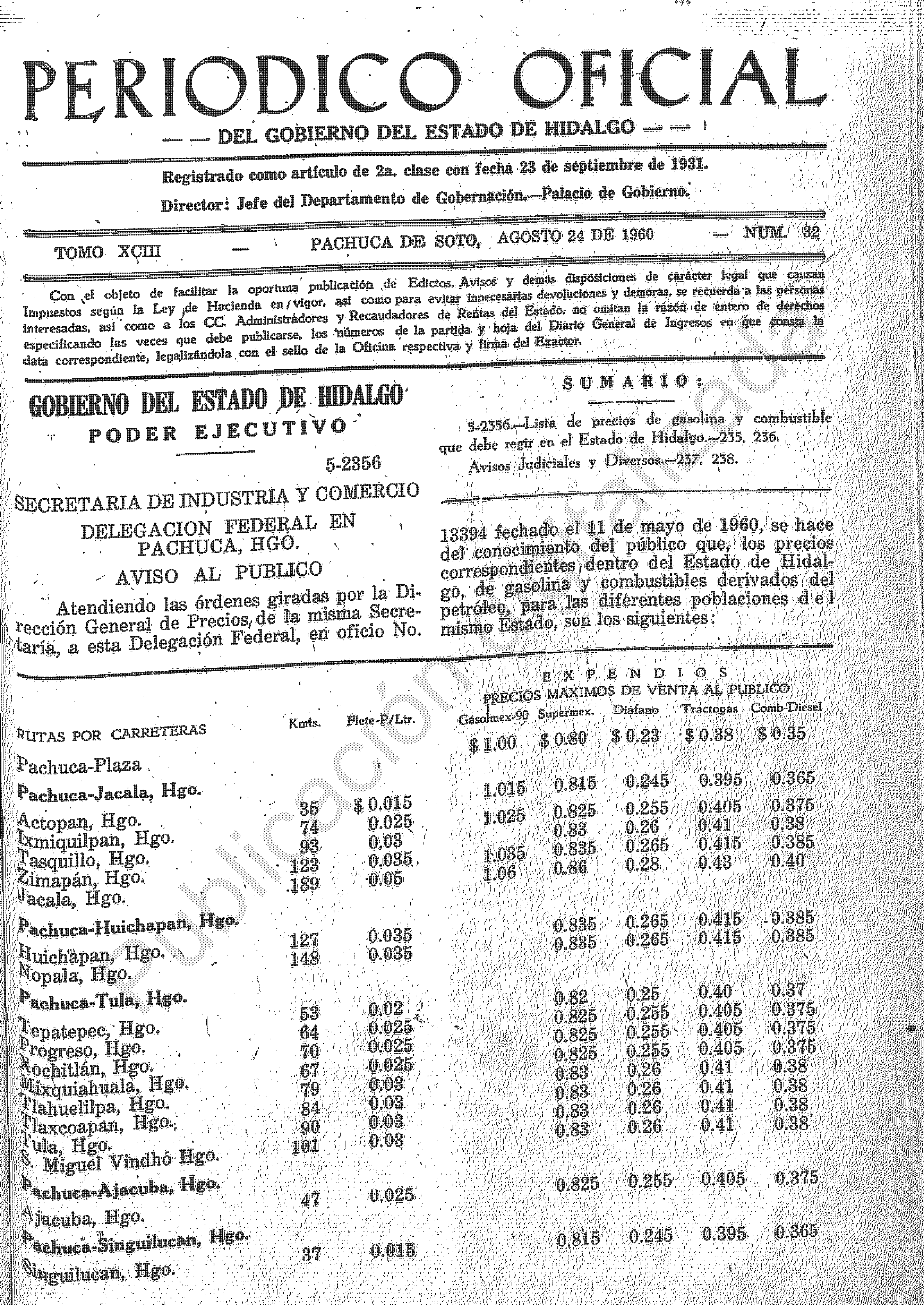 - 5-2336.- Lista de precios de gasolina y combustible que debe regir en el Estado de Hidalgo.