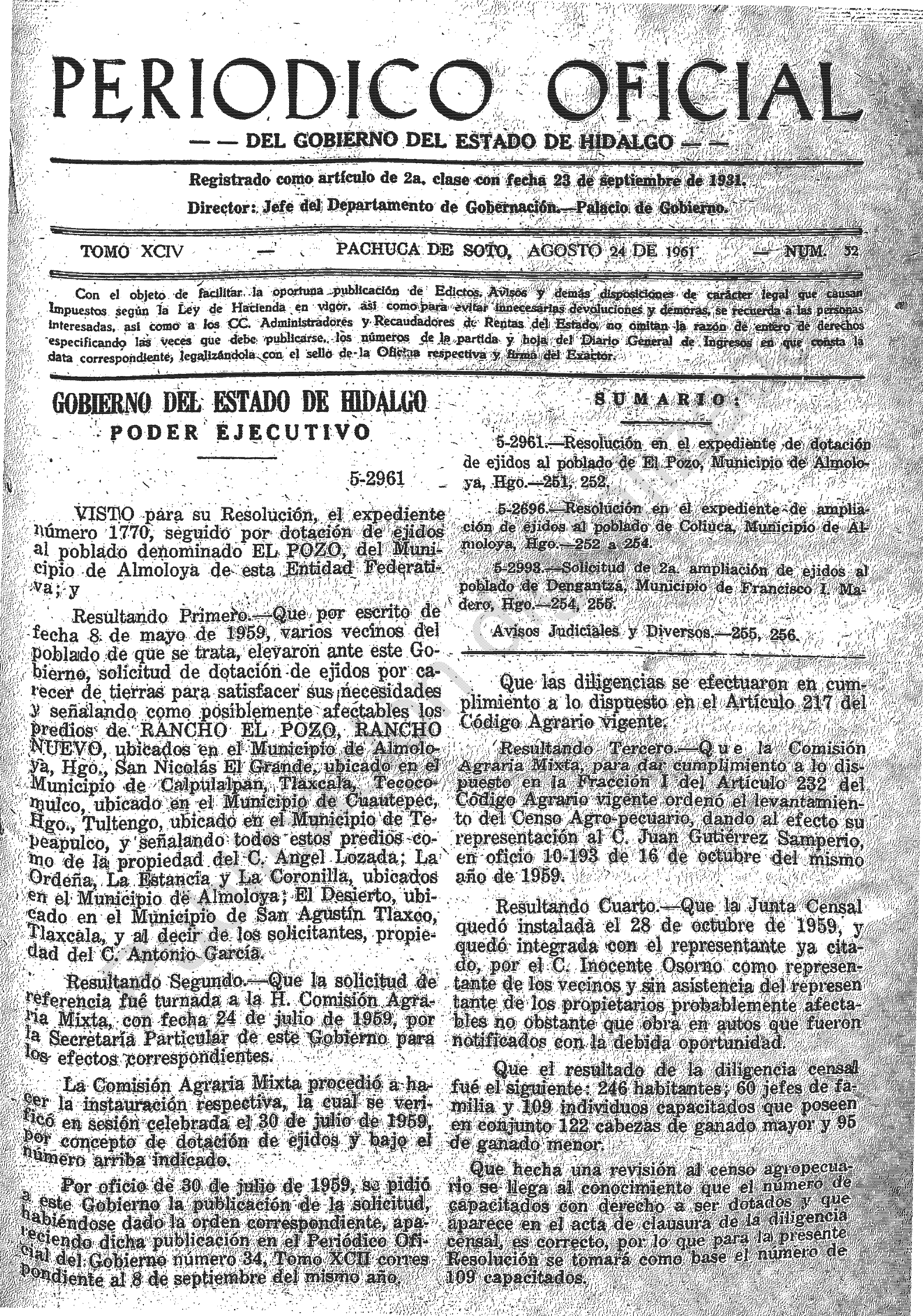 Descargar Periódico Oficial Ordinario 0 del 24 de agosto de 1961