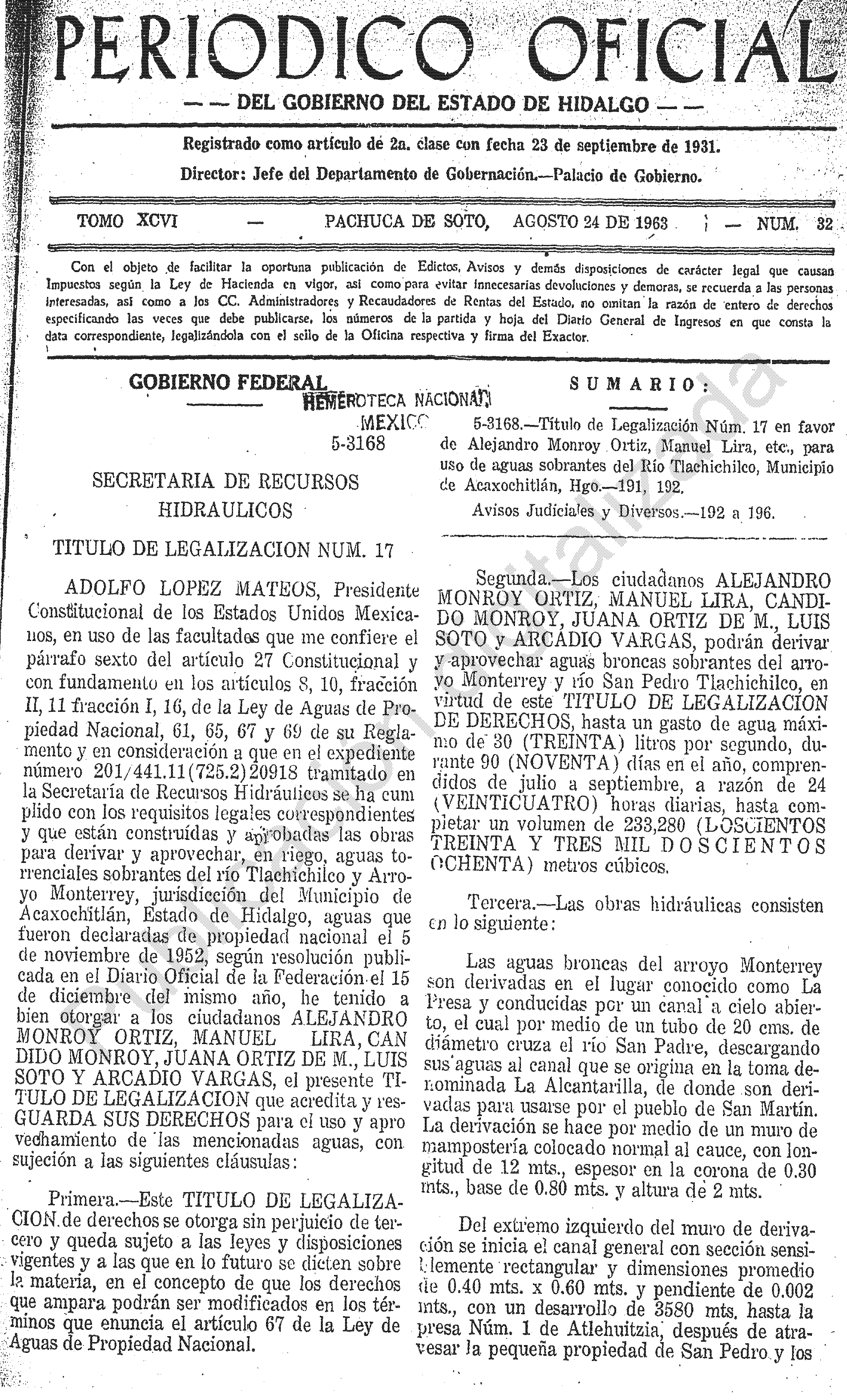 - 5-3168.- Título de Legalización Núm. 17 a favor de Alejandro Monroy Ortiz, Manuel Lira, etc., para uso de aguas sobrantes del Río Tlachichilco, Municipio de Acaxochitlán, Hgo.