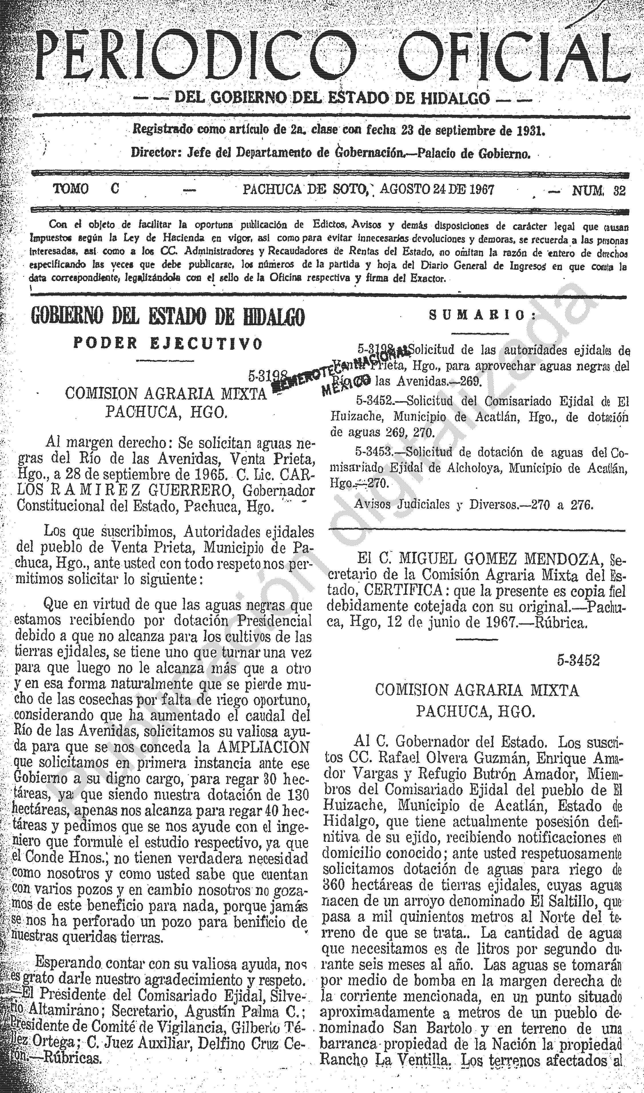 - 5-3452.- Solicitud del Comisariado Ejidal El Huizache, Municipio de Acatlán, Hgo., de dotación de aguas.