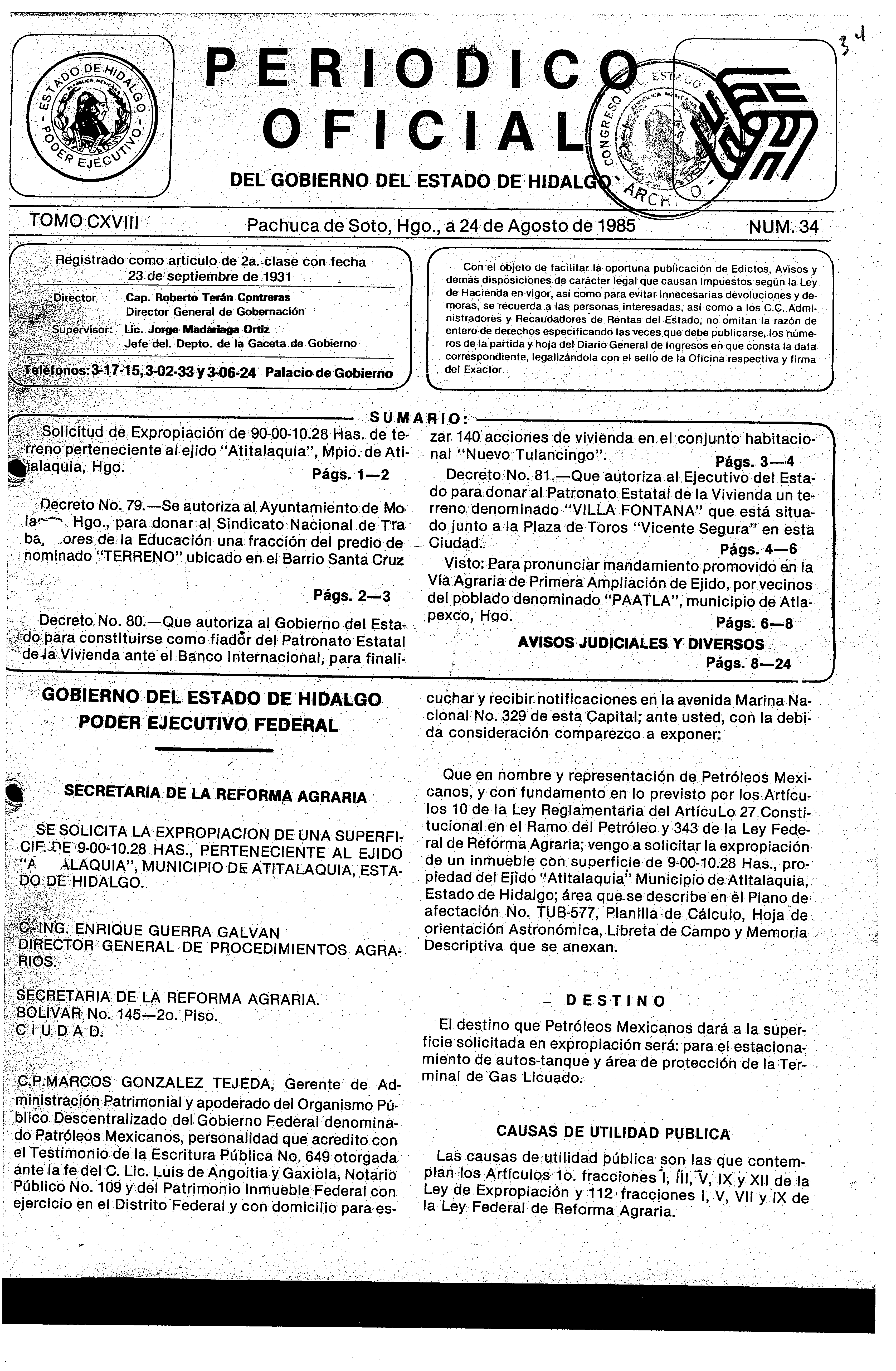 • Solicitud de Expropiación de 90-00-10.28 Has. De terreno perteneciente al ejido “Atitalaquia”, Mpio. de Atitalaquia, Hgo.