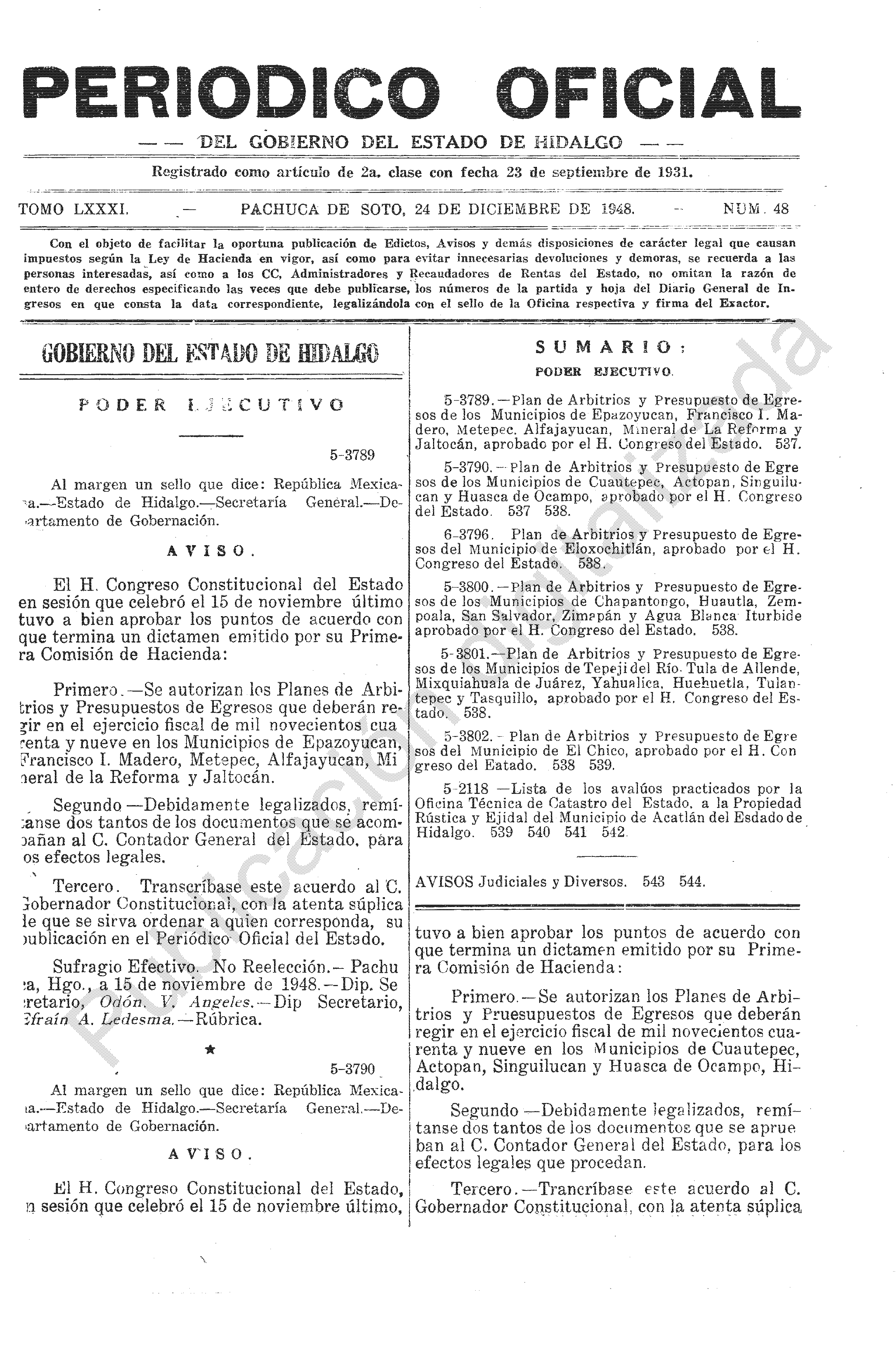 - 5-3789.- Plan de Arbitrios y Presupuesto de Egresos de los Municipios de Epazoyucan, Francisco I. Madero, Metepec, Alfajayucan, Mineral de La Reforma y Jaltocán, aprobado por el H. Congreso del Estado.