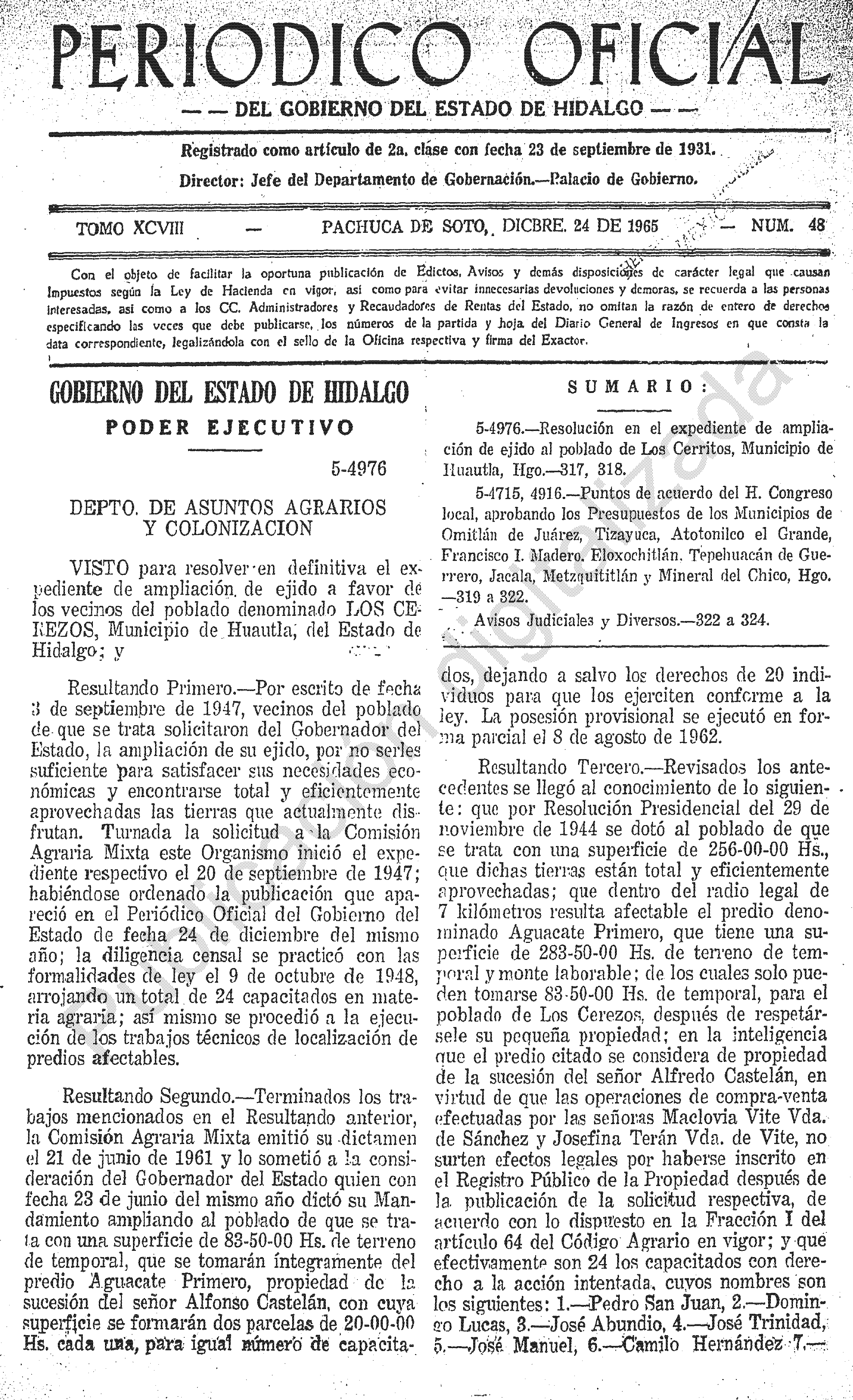 - 5-4976.- Resolución en el expediente de ampliación de ejido al poblado de Los Cerritos, Municipio de Huautla, Hgo.