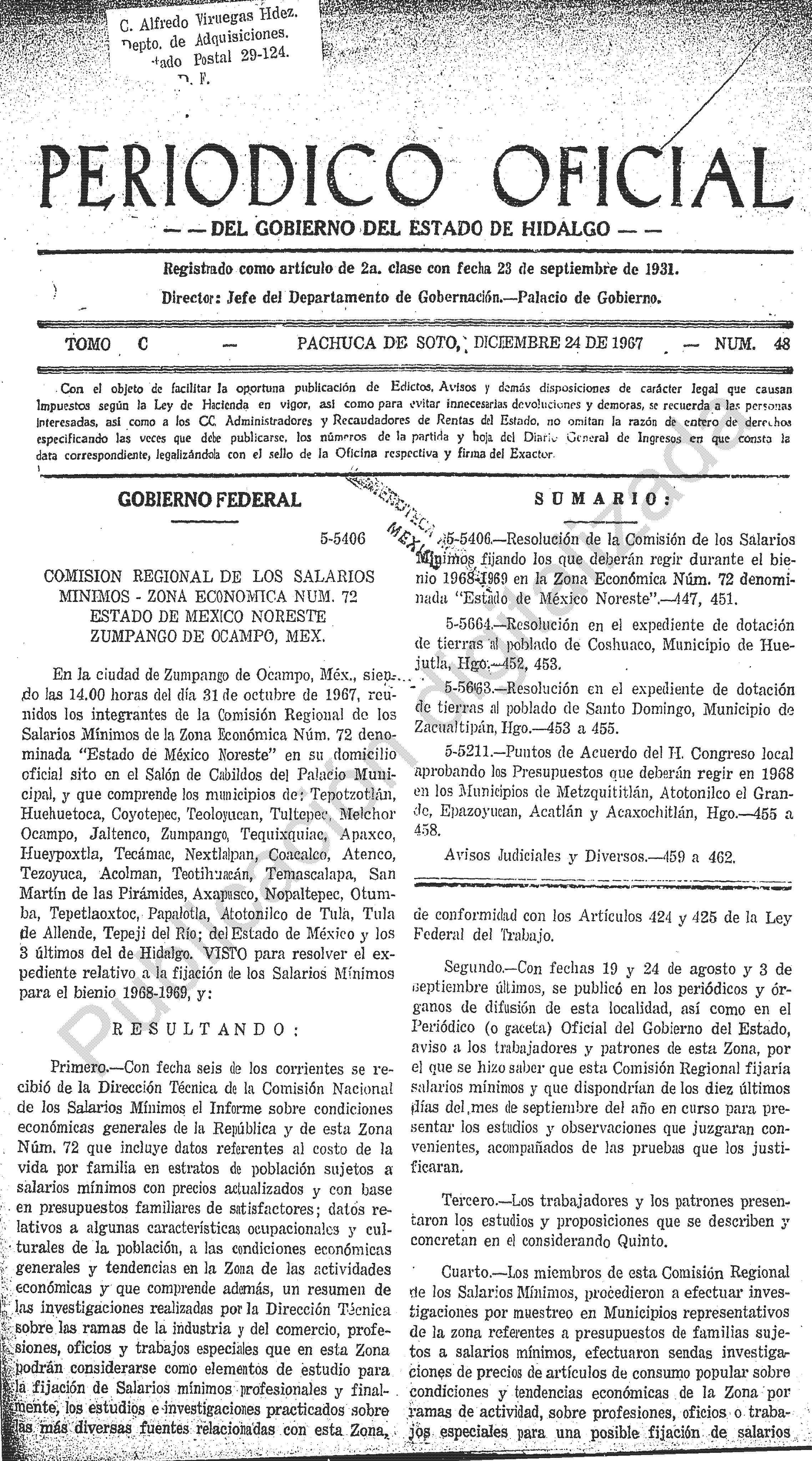 - 5-5406.- Resolución de la Comisión de los Salarios Mínimos fijando los que deberán regir durante el bienio 1968-1969 en la Zona Económica Núm. 72 denominada “Estado de México Noroeste”.