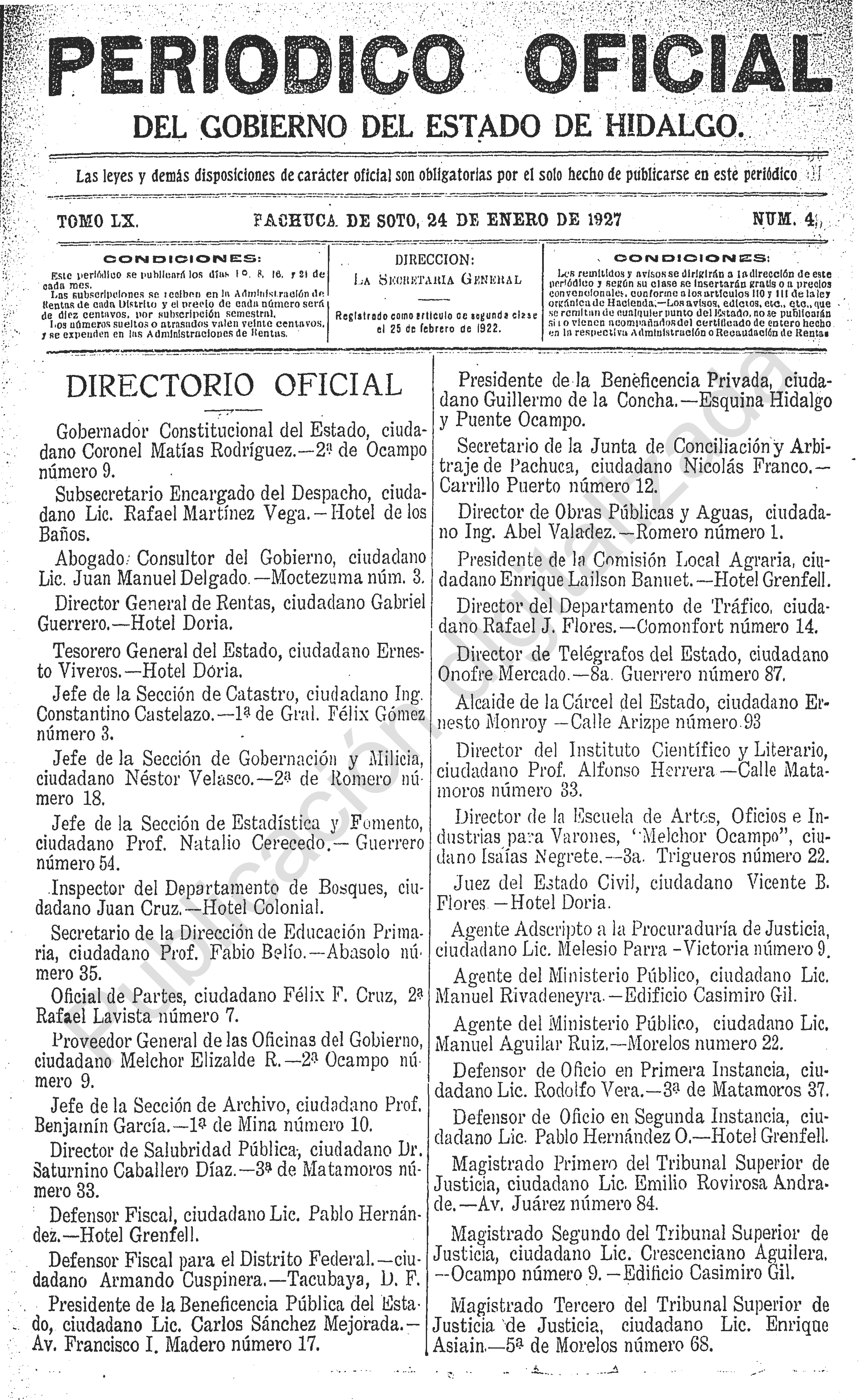 Descargar Periódico Oficial Ordinario 0 del 24 de enero de 1927El portal web del Periódico Oficial del Estado de hidalgo es el único medio de difusión oficial del Gobierno del Estado de Hidalgo