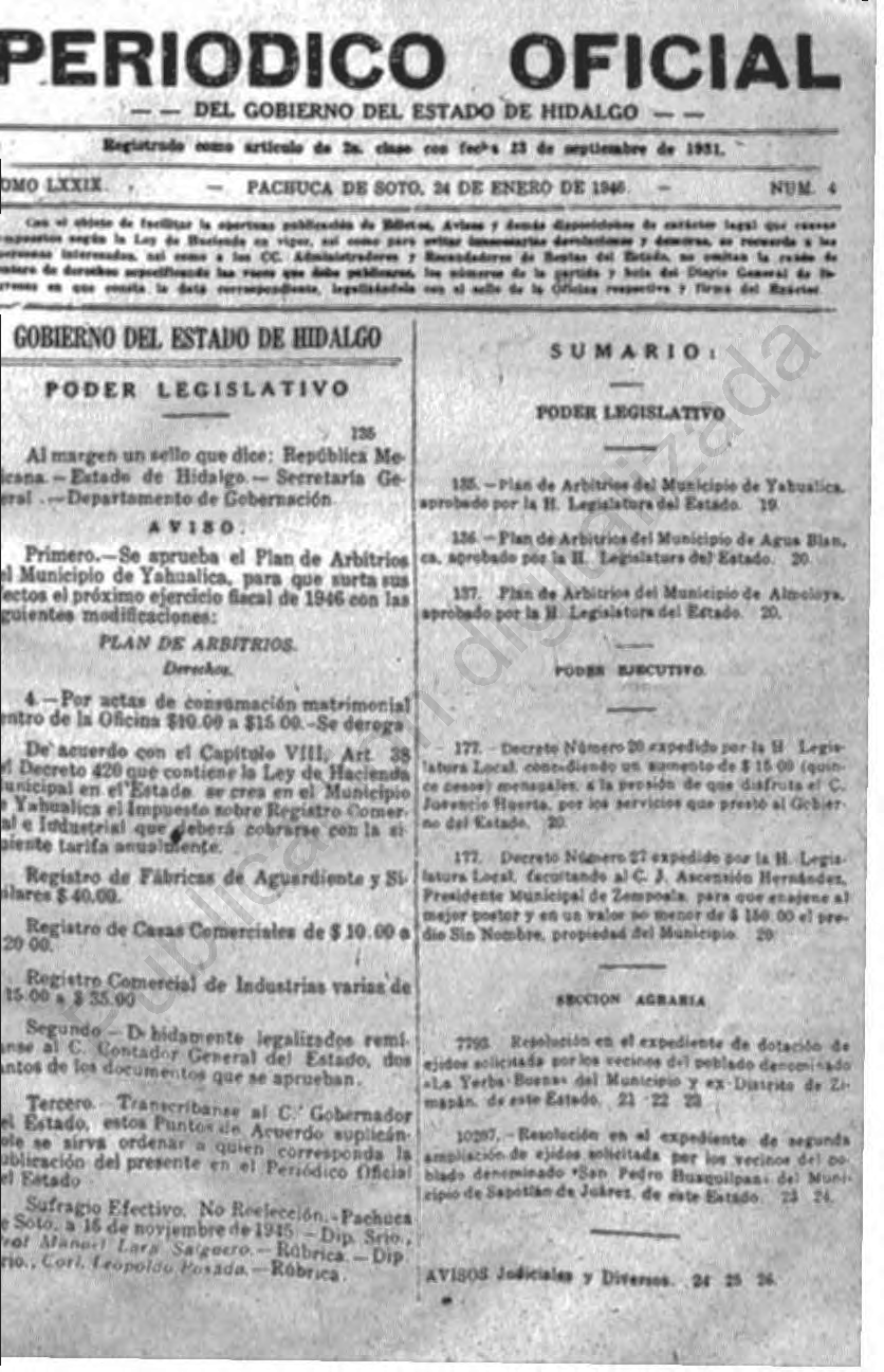 - 7793.- Resolución en el expediente de dotación de ejidos solicitada por los vecinos del poblado denominado “La Yerba-Buena” del Municipio y ex Distrito de Zimapán, de este Estado.