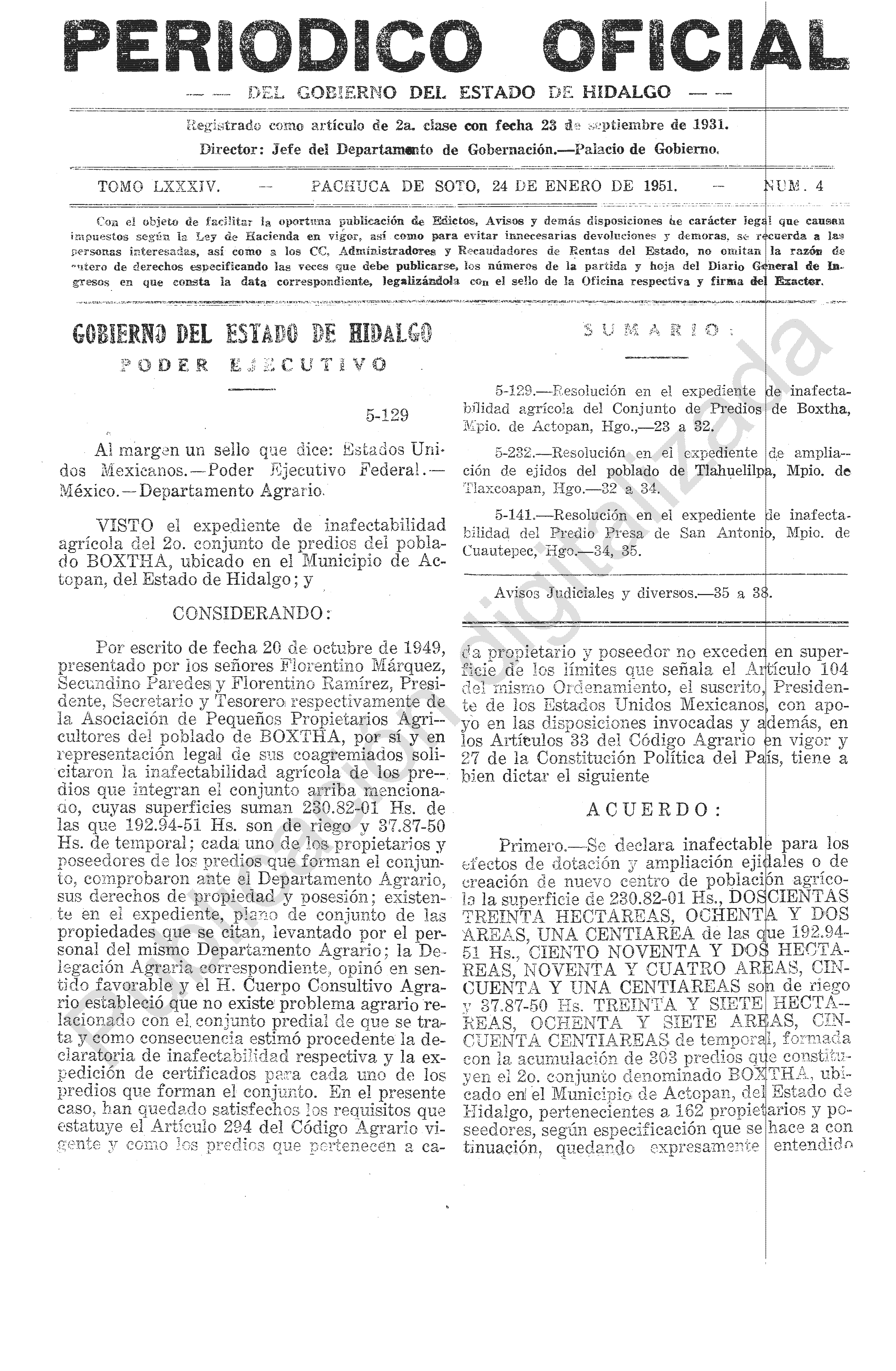 - 5-129.- Resolución en el expediente de inafectabilidad agrícola del Conjunto de Predios de Boxtha, Mpio. de Actopan, Hgo.