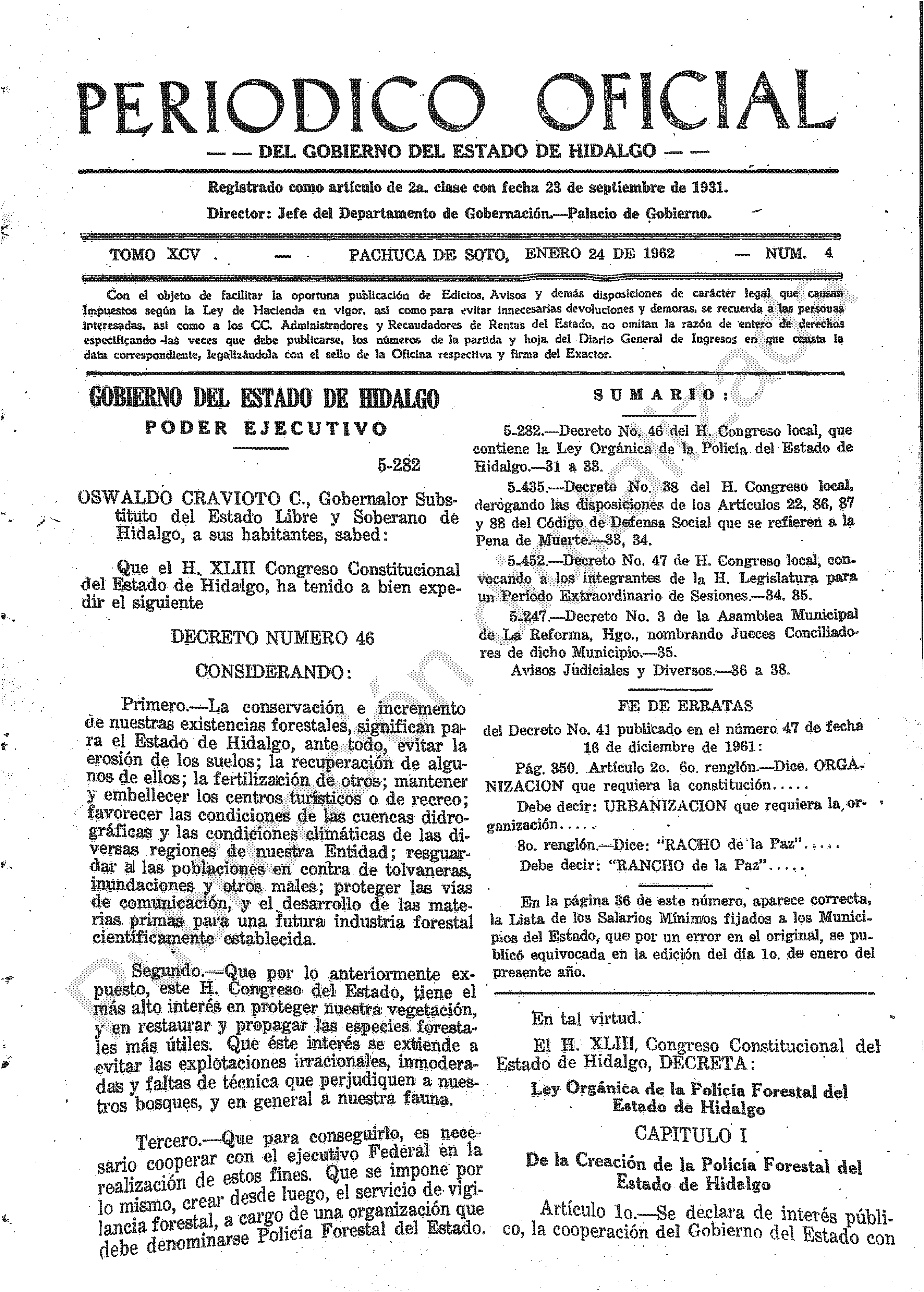 • 5-282.- Decreto No. 46 del H. Congreso local, que contiene la Ley Orgánica de la Policía del Estado de Hidalgo.