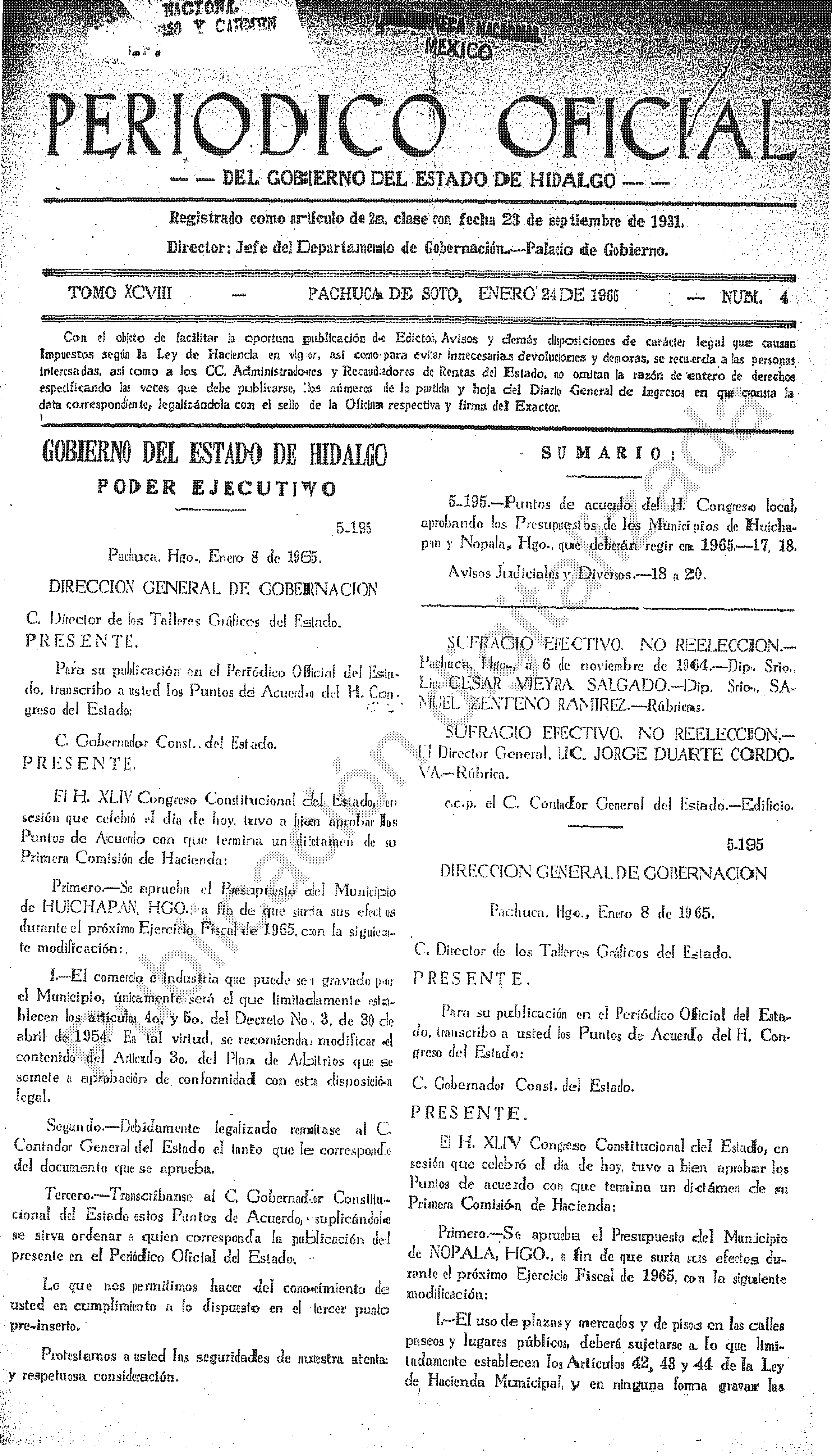 - 5-195.- Puntos de acuerdo del H. Congreso local, aprobando los Presupuestos de los Municipios de Huichapan y Nopala, Hgo., que deberán regir en 1965.