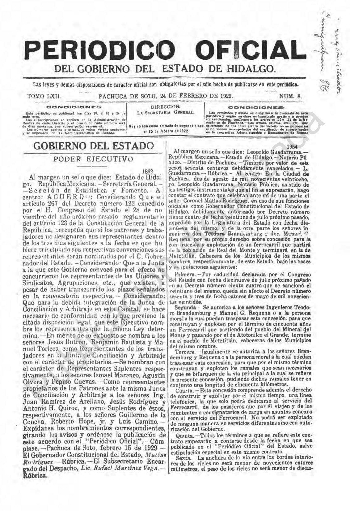 • 1954.-Hago constar el contrato que celebran ante mi de una parte el señor Coronel Matias Rodriguez en uso de sus funciones como Gobernador Constitucional del Estado de Hidalgo debidamente autorizado por Decreto número cincunta y cuatro de fecha veintiuno de julio proximo pasado. expedido por las Legislatura del Estado con fecha diecinueve del mismo y de la otra parte los señores ingenieros don Teodoro Brandemburg y Don Manuel G. Requena, por su propio derecho sobre concesión para la construcción y explotación de un ferrocarril que partira de la población de Real del Monte y terminara en la Metztitlan.