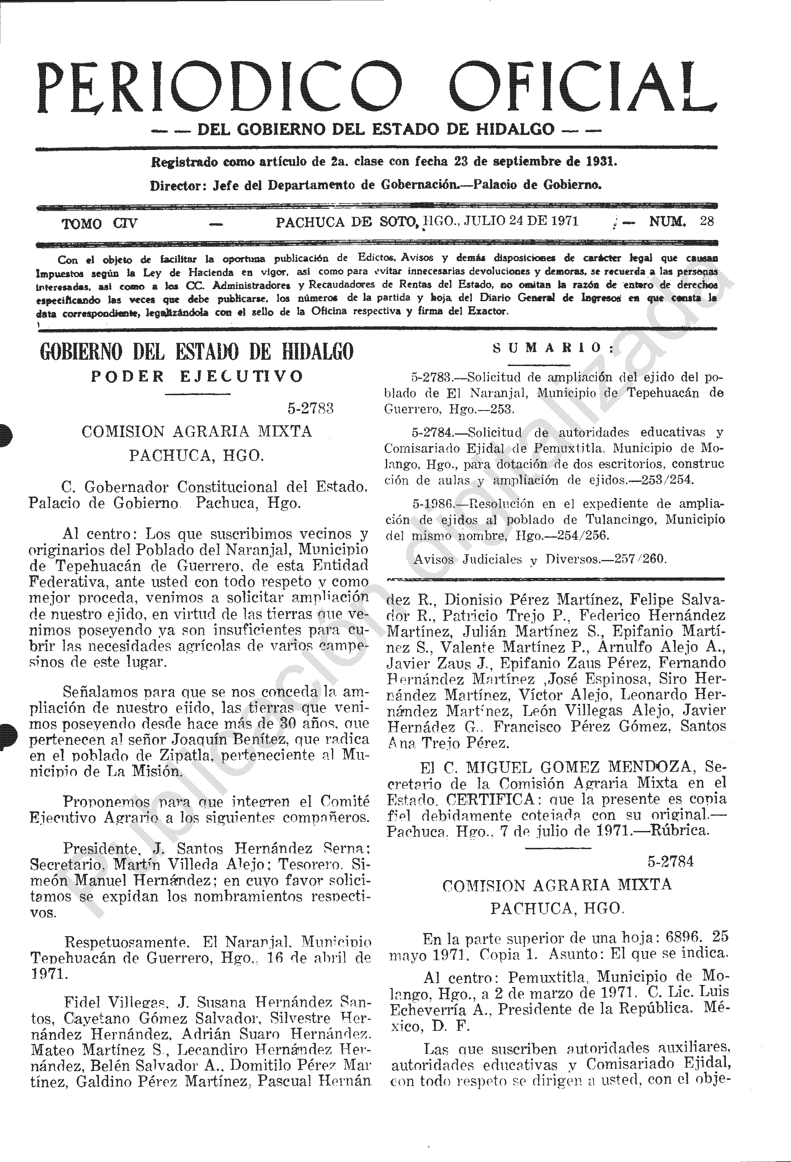 - 5-2783.- Solicitud de ampliación del ejido del poblado de El Naranjal, Municipio de Tepehuacán de Guerrero, Hgo.