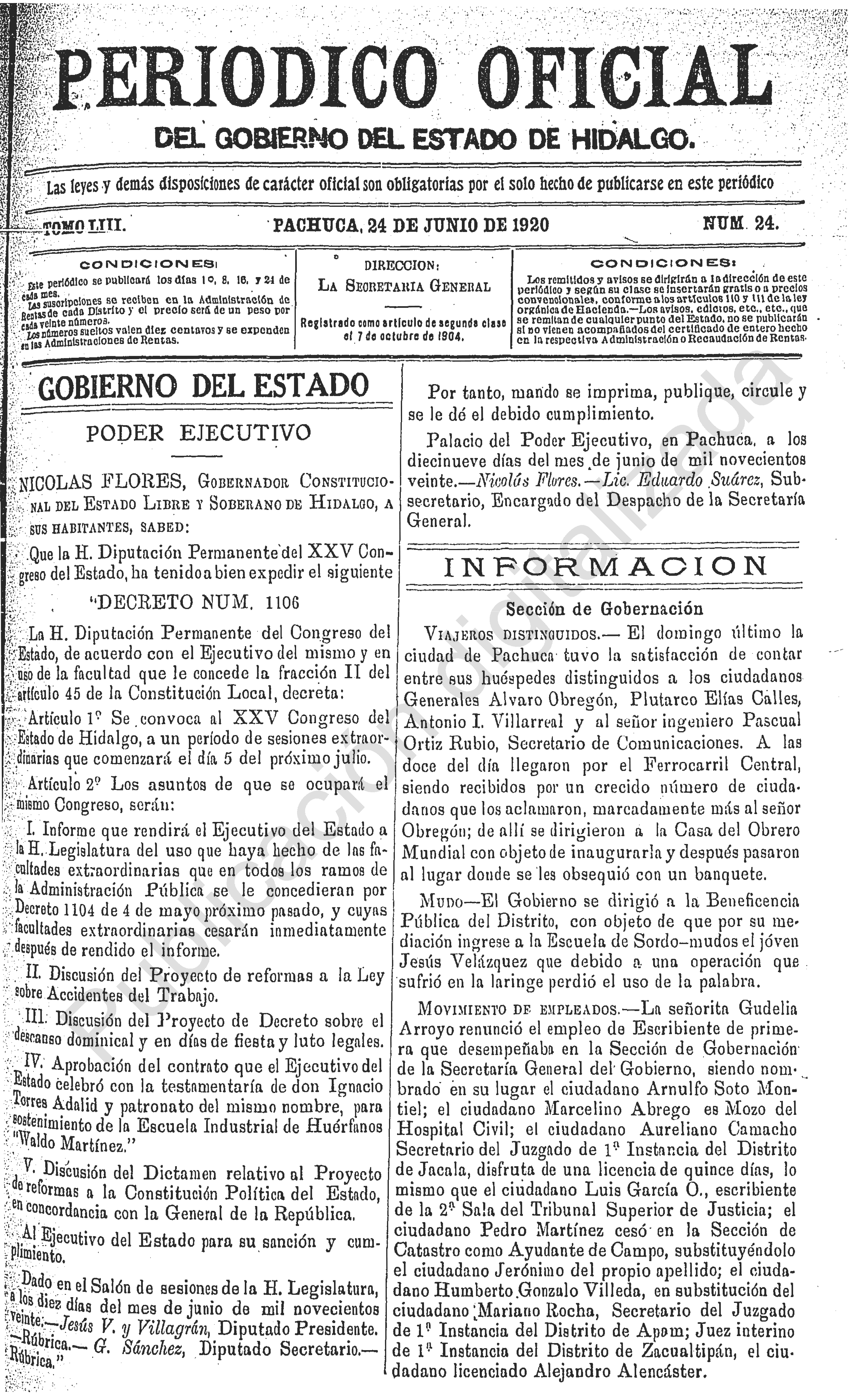 • Poder Ejecutivo, Nicolas Flores, Gobernador Constitucional del Estado Libre y Soberano de Hidalgo, Decreto número 1106, se convoca al XXV Congreso del Estado de Hidalgo, a un periodo de sesiones extraordinarias.
