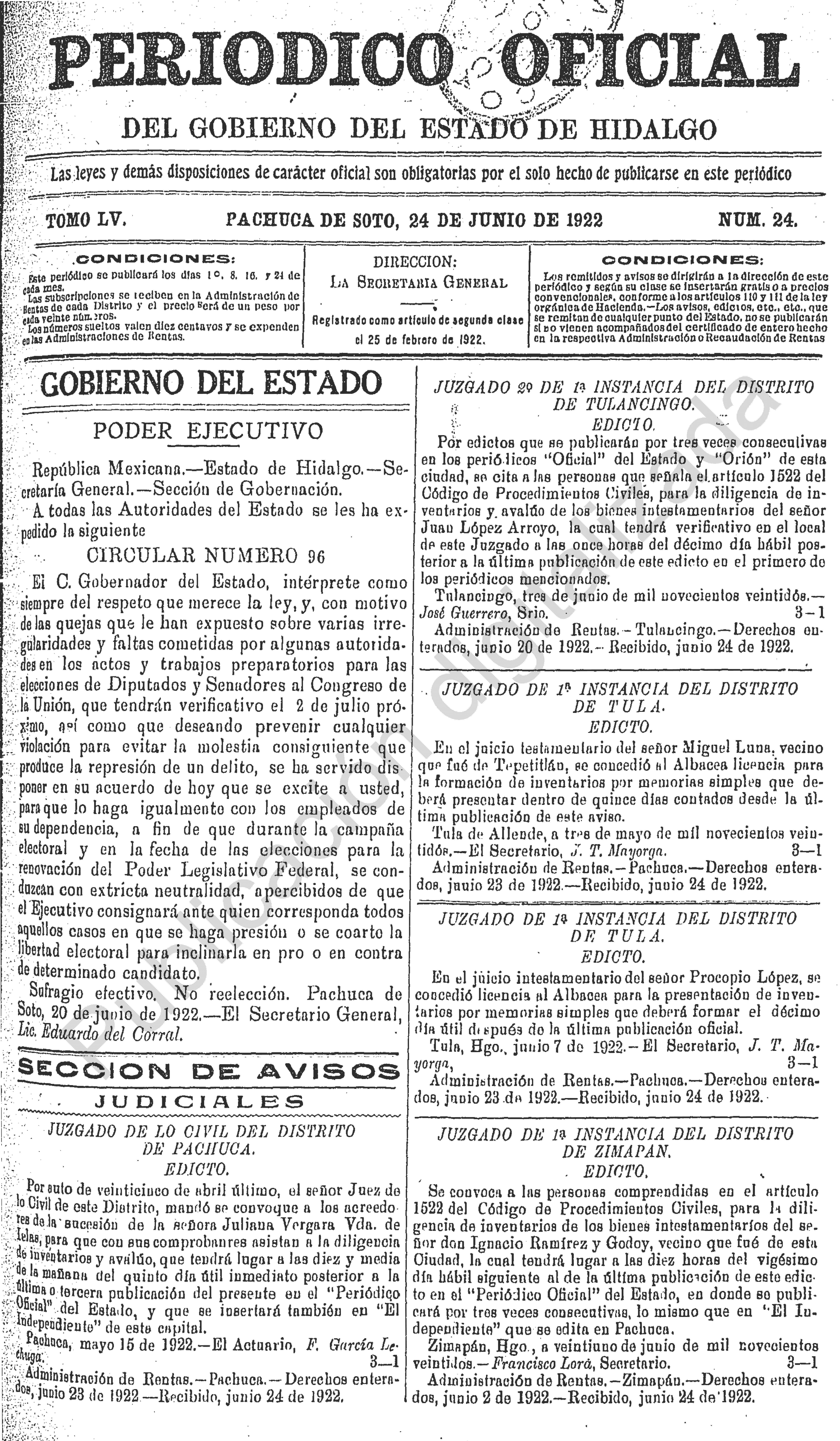 Descargar Periódico Oficial Ordinario 0 del 24 de junio de 1922El portal web del Periódico Oficial del Estado de hidalgo es el único medio de difusión oficial del Gobierno del Estado de Hidalgo