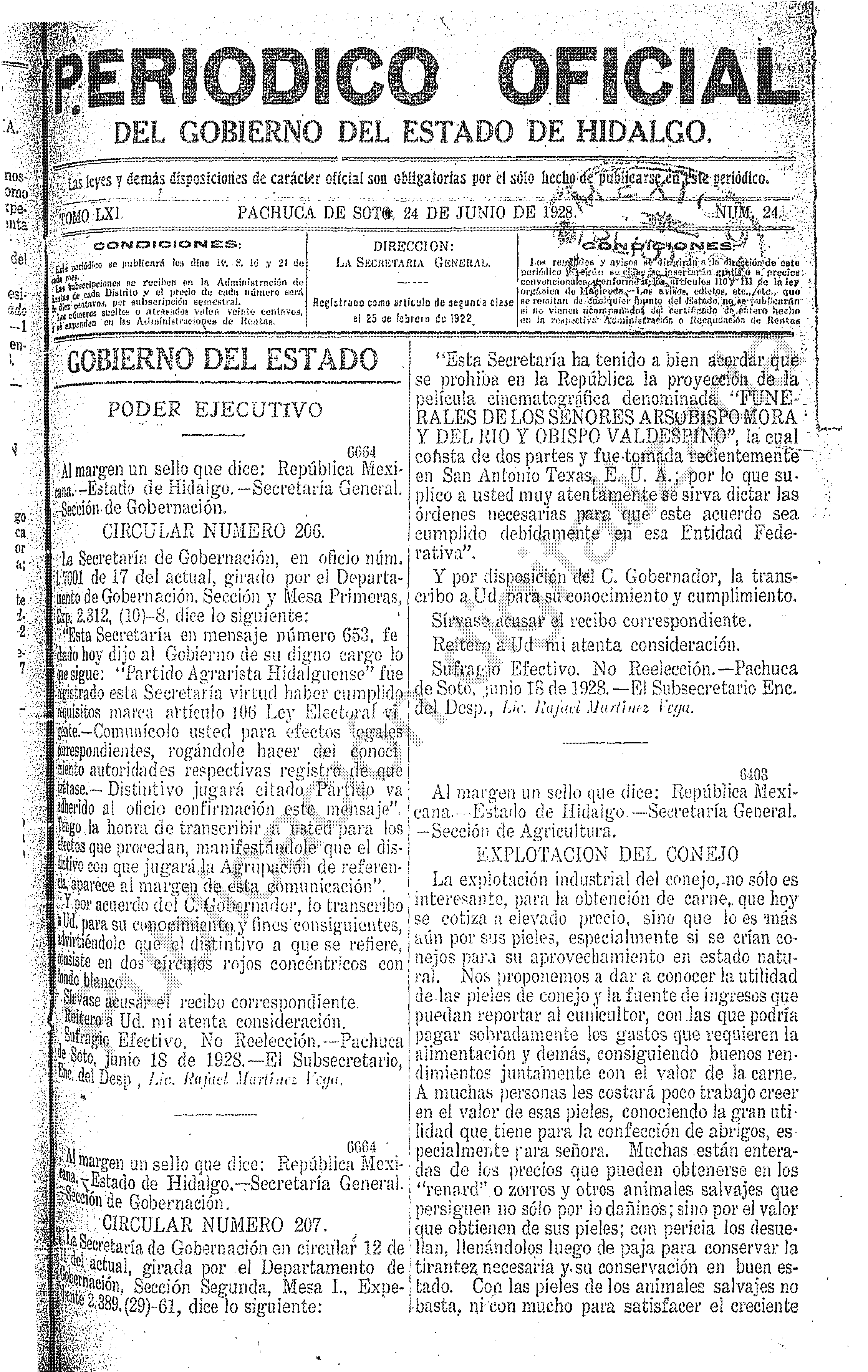 - 6664.-CIRCULAR NUMERO 207.-Esta Secretaria ha tenido a bien acordar que se prohiba en la republica la Proyección de la Pelicula Cinematografica denominada “FUNERALES DE LOS SEÑORES ARSOBISPO MORA Y DEL RIO Y OBISPO VALDESPINO” La cual consta de dos partes y fue tomada recientemente en San Antonio Texas, E.U.A.