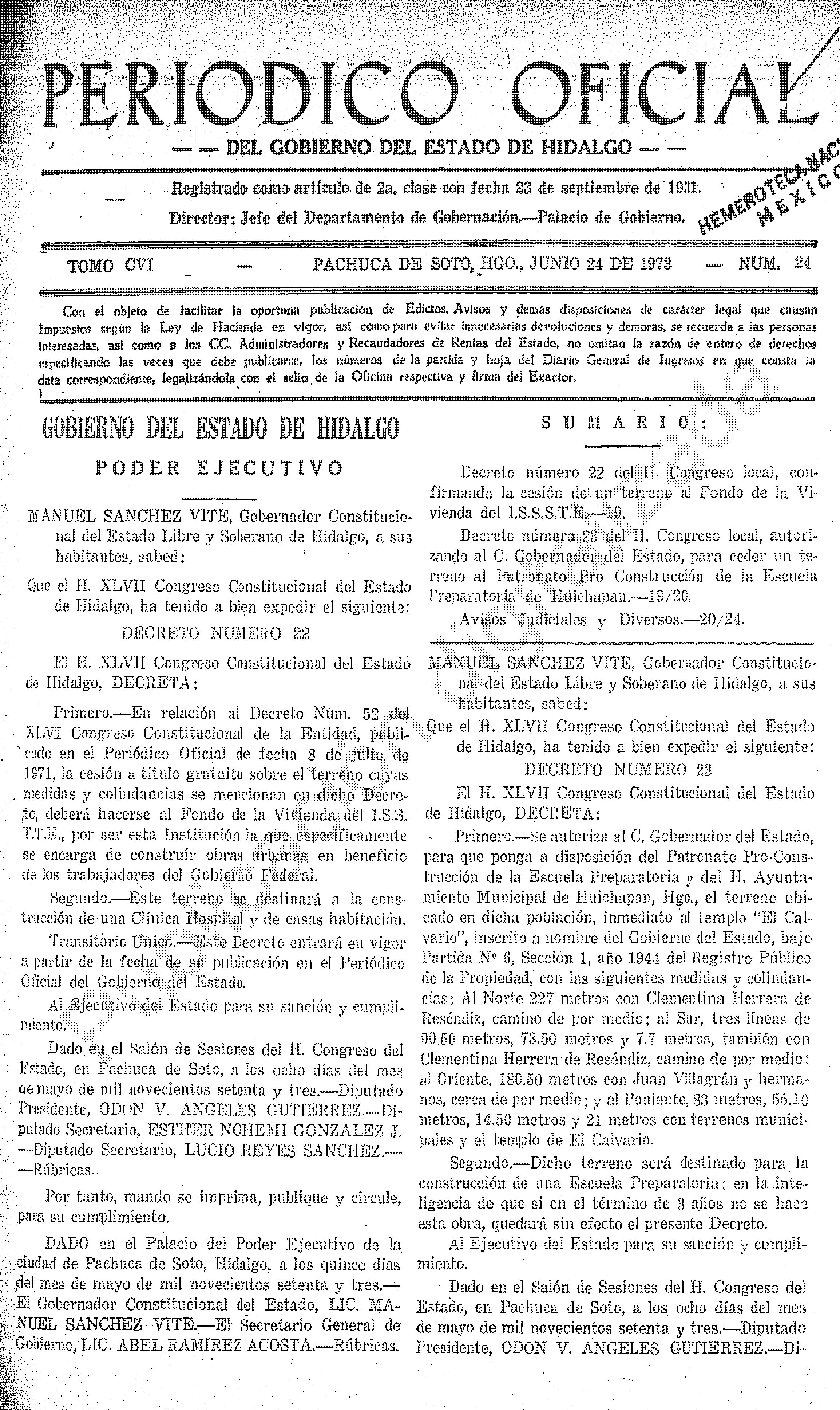 - Decreto número 23 del H. Congreso local, autorizando al C. Gobernador del Estado, para ceder un terreno al Patronato Por Construcción de la Escuela Preparatoria de Huichapan.