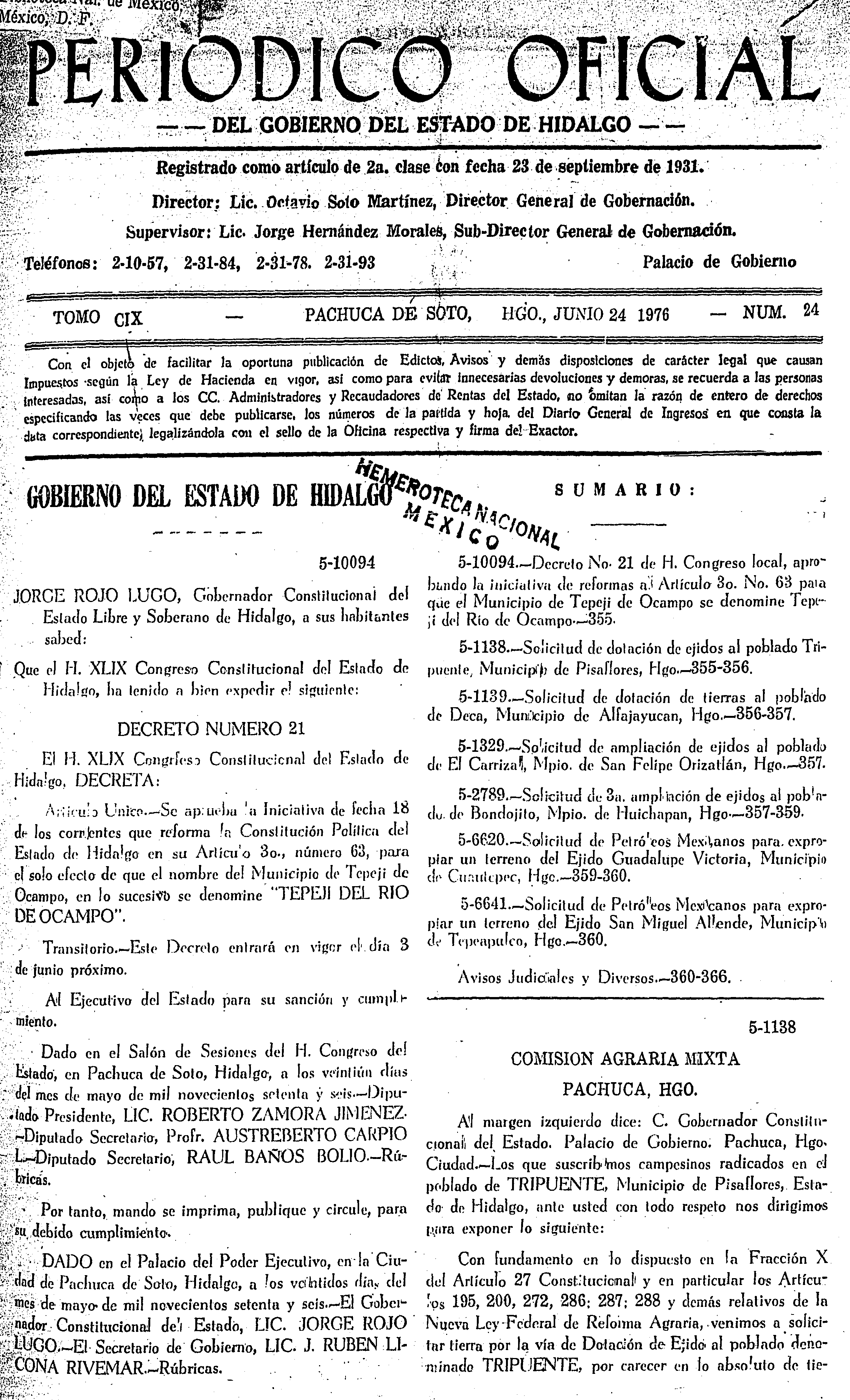 Descargar Periódico Oficial Ordinario 0 del 24 de junio de 1976