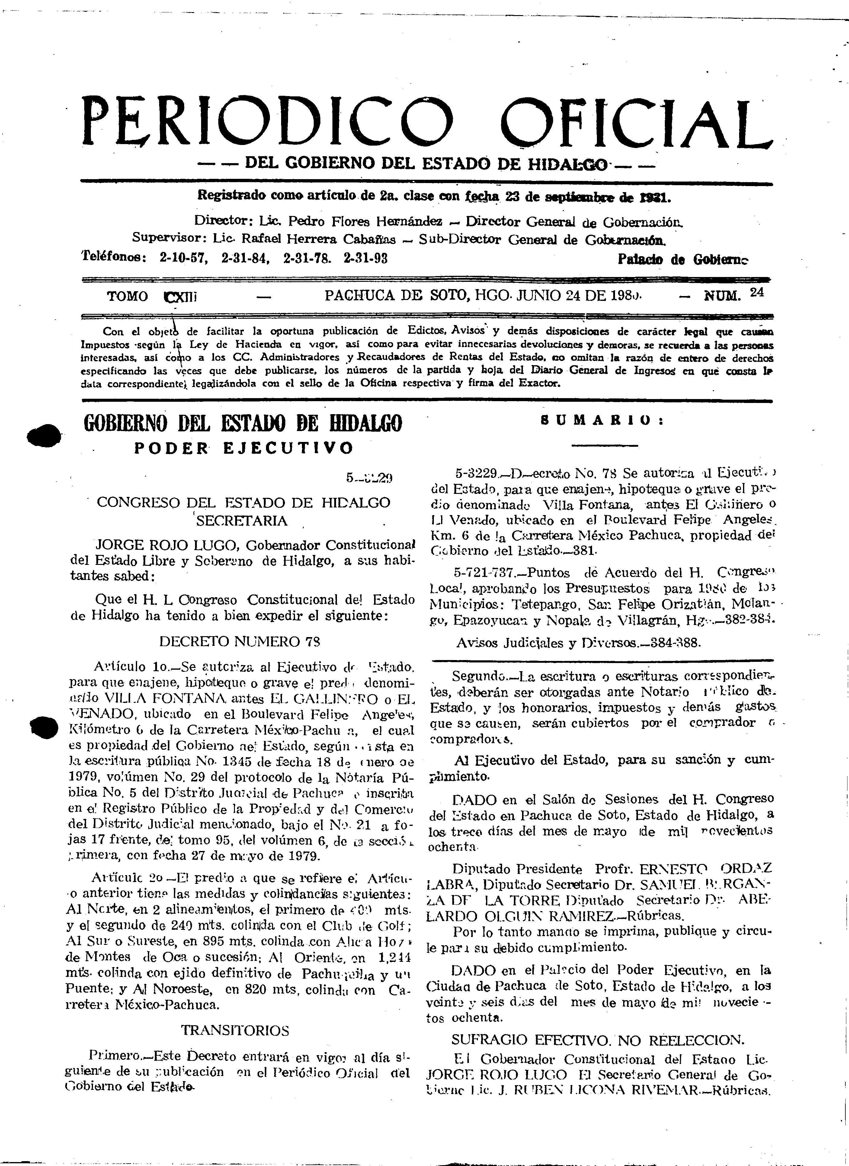 - 5-3229.- Decreto No. 78, Se autoriza de al Ejecutivo del Estado, para que enajene, hipoteque o grave el predio denominado Villa Fontana, antes El Osinero o LI Venado, ubicado en el Boulevard Felipe Angeles Km. 6 de la Carretera México-Pachuca, propiedad del Gobierno del Estado.