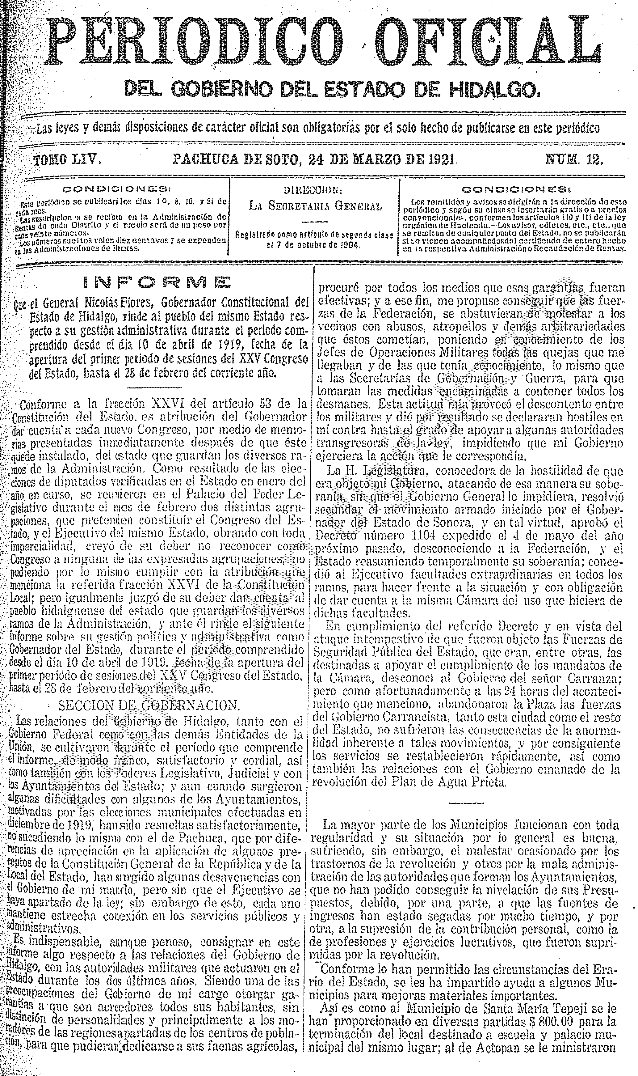 Descargar Periódico Oficial Ordinario 0 del 24 de marzo de 1921El portal web del Periódico Oficial del Estado de hidalgo es el único medio de difusión oficial del Gobierno del Estado de Hidalgo